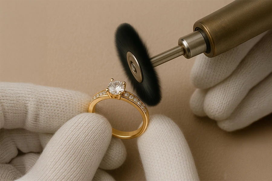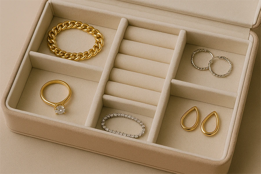 Šperky by se nikdy neměly ukládat nahodile do jedné šperkovnice, kde se mohou poškrábat. Ideální je uchovávat je odděleně – například v samostatných látkových sáčcích nebo přihrádkách. U zlatých prstenů či náušnic je důležité zabránit styku s jinými kovy, aby nedocházelo k drobným oděrkám či změnám barvy.