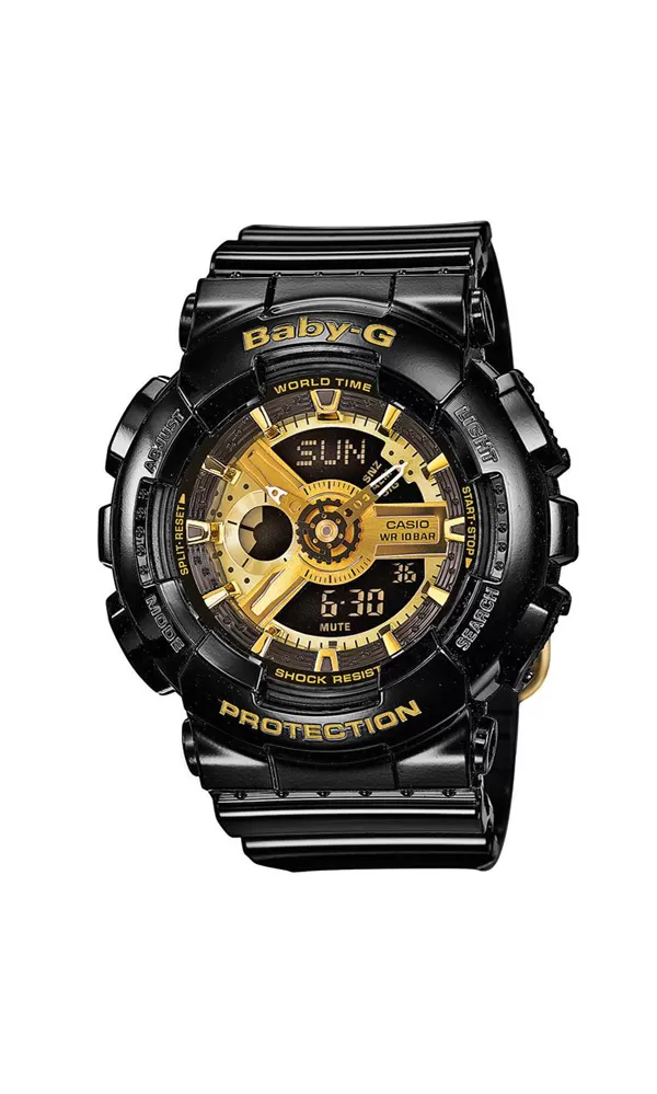 Dámské náramkové hodinky z kolekce BABY-G. Hodinky mají velice zajímavé provedení se zlatým ciferníkem, který dodává luxusní design.