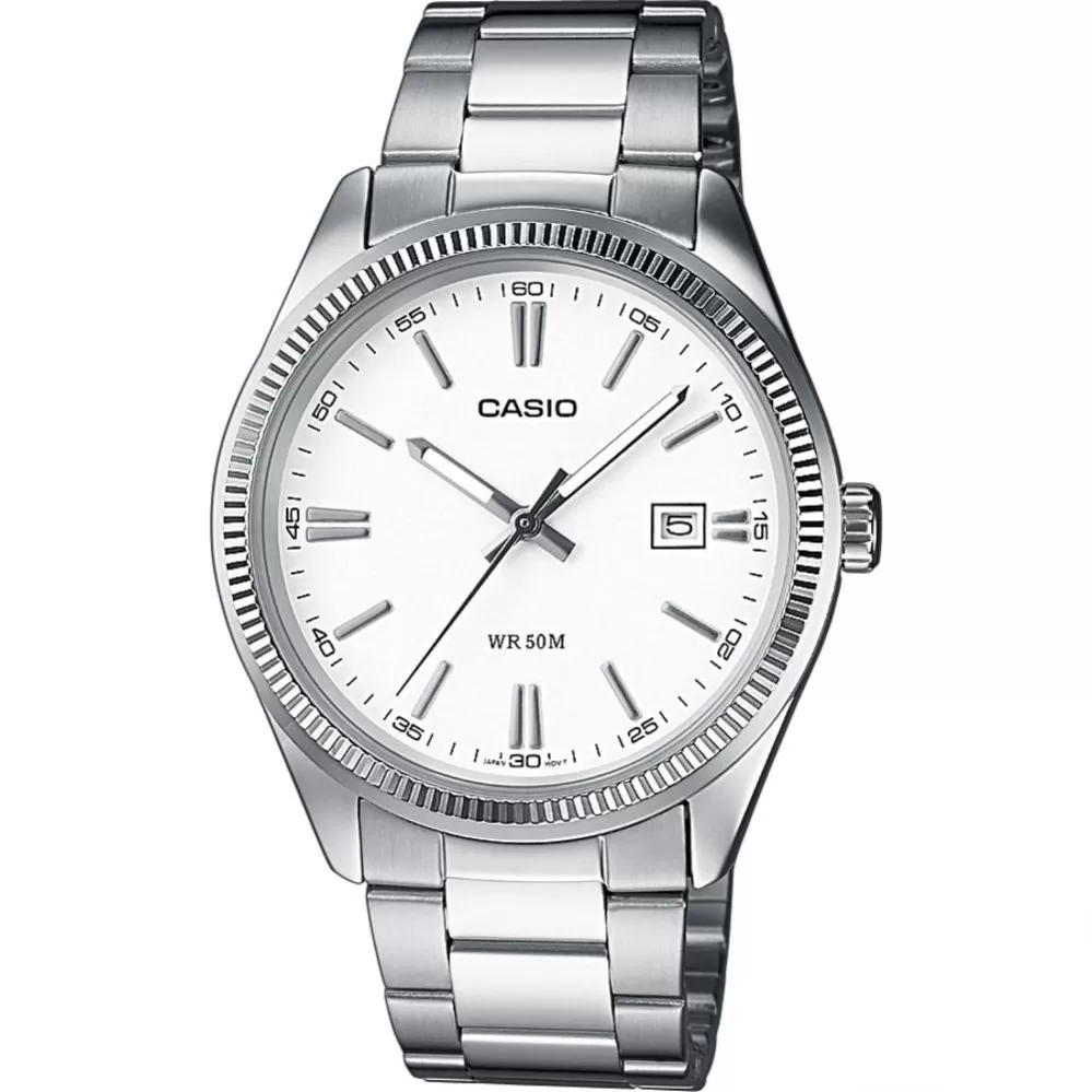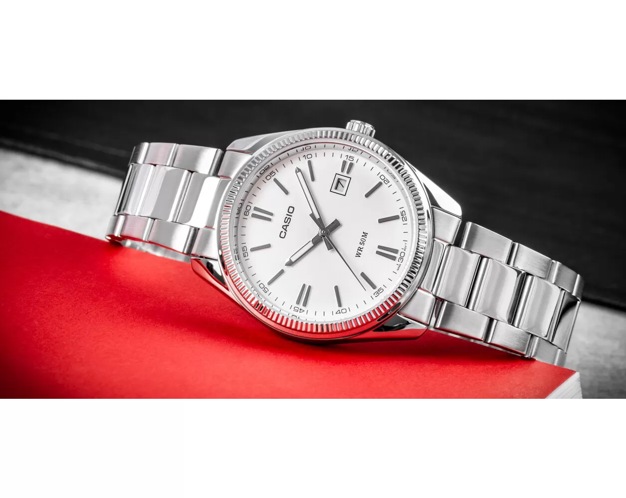 Jednoduché pánské hodinky Casio z kolekce Collection MTP-1302PD-7A1VEF. Hodinky mají mosazné pouzdro ve stříbrné barvě v kombinaci s ocelovým řemínkem. Hodinky disponují ukazatelem data.