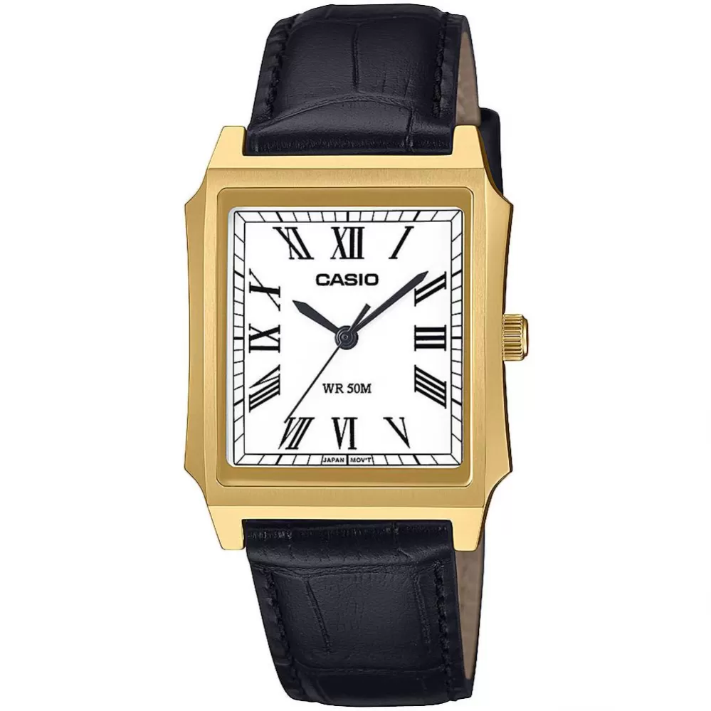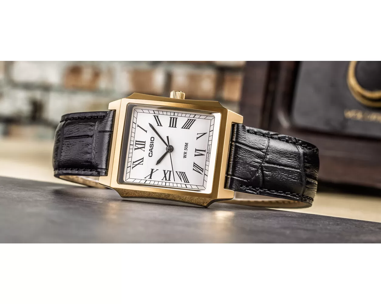 Klasické pánské hodinky Casio MTP-B190GL-7BVEF z kolekce Collection. Hodinky mají ocelové pouzdro s PVD zlacením ve zlaté barvě a kožený černý řemínek a v kombinaci s bílým ciferníkem.