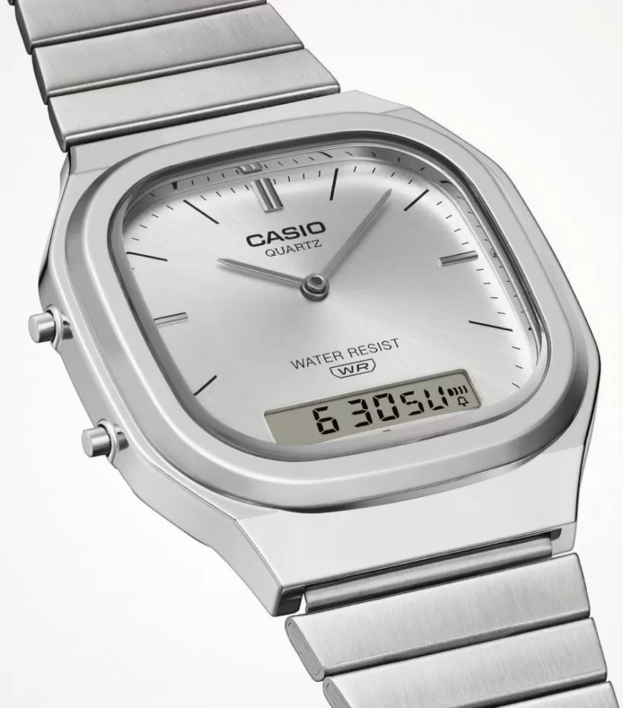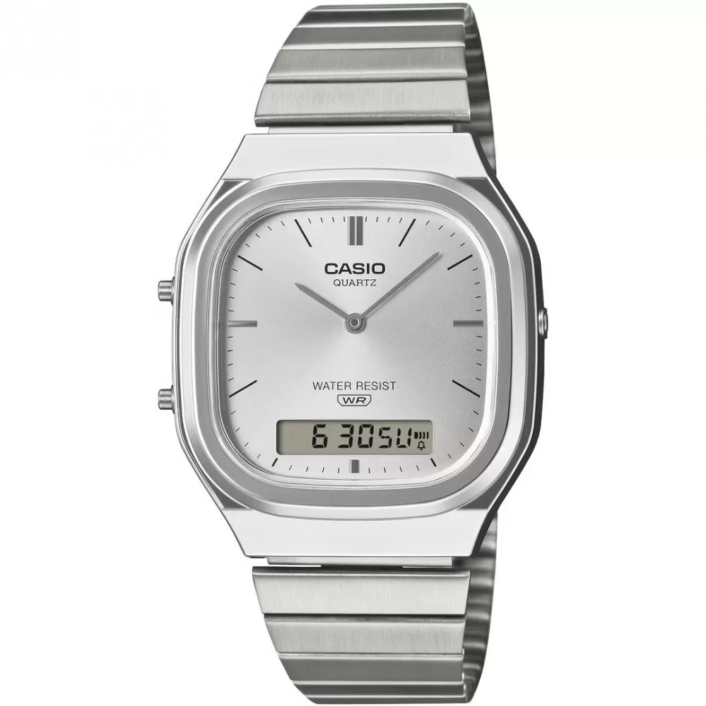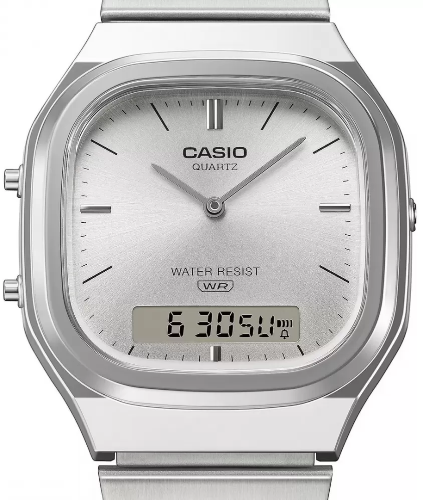 Casio AQ-240E-7AEF – elegantní duální hodinky ve stříbrném provedení. Model Casio AQ-240E-7AEF kombinuje klasické analogové ručičky s digitálním displejem, čímž vytváří nadčasové a zároveň praktické řešení pro každodenní nošení. Hodinky zaujmou čistě stříbrným kovovým provedením pouzdra a tahu, které jim dodává univerzální, elegantní a reprezentativní vzhled vhodný jak do kanceláře, tak na volnočasové aktivity.
