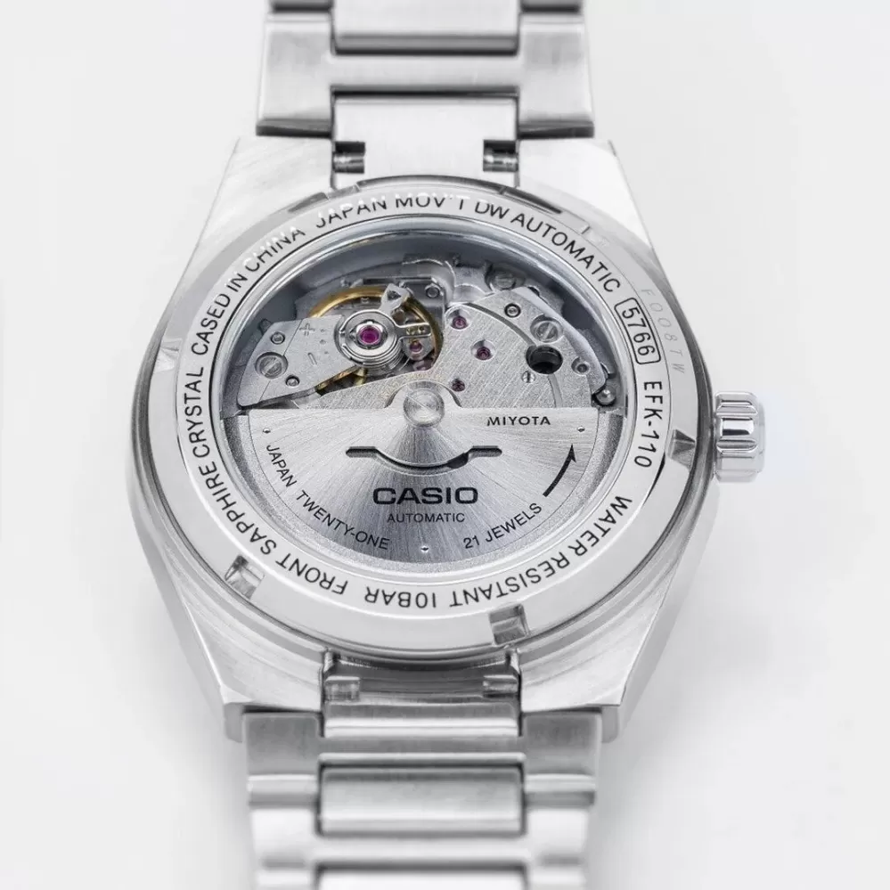 Casio Edifice EFK-110D-1AER – sportovní chronograf s automatickým strojkem. Model EFK-110D-1AER kombinuje elegantní analogový design s moderními funkcemi chronografu a automatickým strojkem, který zajišťuje plynulý chod ruček bez potřeby baterie. Černý ciferník s kontrastními stříbrnými ručičkami a indexy dodává hodinkám sofistikovaný a dynamický vzhled.