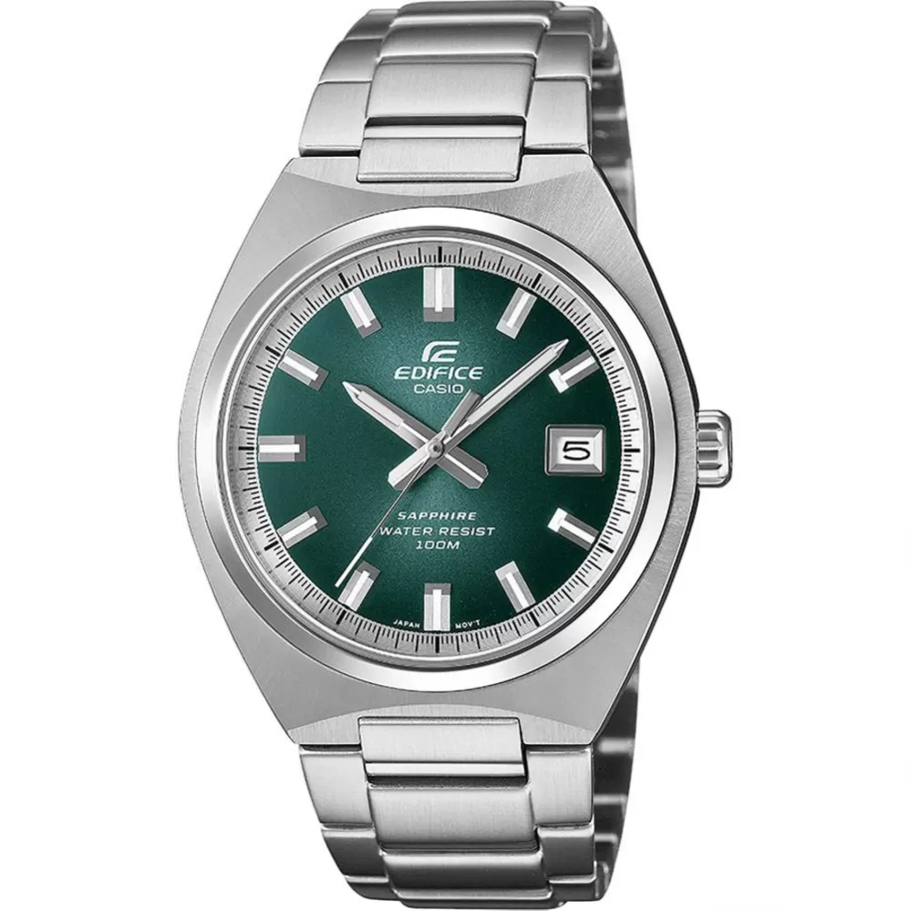 Casio Edifice EFB-109D-3AVEF – sportovní elegance s chronografem. Model EFB-109D-3AVEF kombinuje klasickou eleganci s moderním sportovním designem. Hodinky mají nerezové pouzdro a tah, tmavě zelený ciferník s kontrastními ručičkami a chronografy, které dodávají hodinkám dynamický a sofistikovaný vzhled.