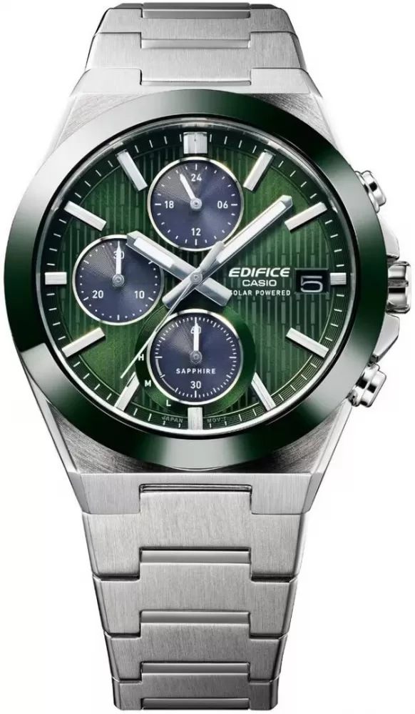 Casio Edifice EFS-S650D-3AEF – solární chronograf s výrazným zeleným ciferníkem. Model EFS-S650D-3AEF z řady Edifice kombinuje sportovní charakter, moderní technologii a elegantní ocelové zpracování. Dominantním prvkem je hluboký zelený ciferník s chronografem, který dodává hodinkám svěží, dynamický a současně sofistikovaný vzhled.