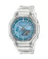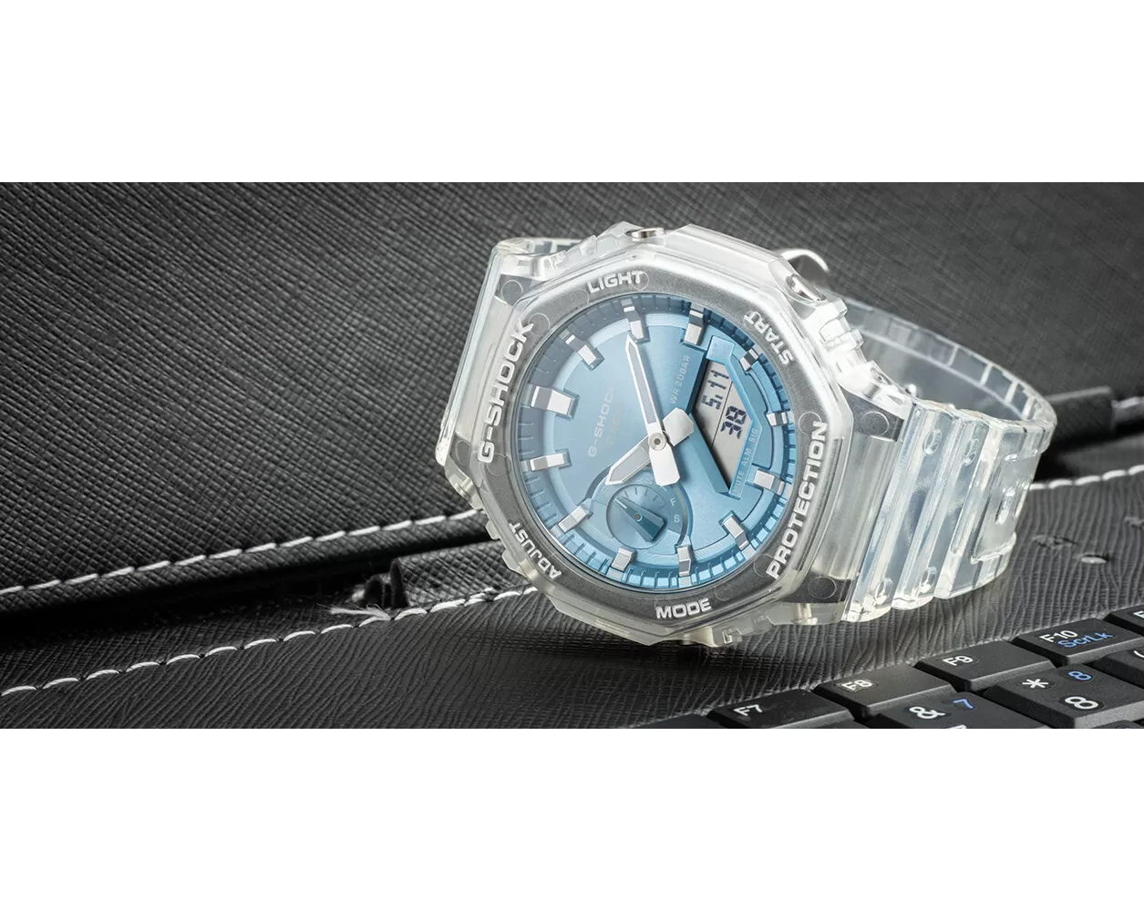 Casio G-Shock GA-2100BM-7A2ER přináší oblíbené metalické číselníky v kombinaci s populárním průhledným pouzdrem a náramkem. Hodinky mají současně tu nejvyšší odolnost. Vysoká odolnost pouzdra je zajištěna konstrukcí Carbon Core Guard. To je vyrobené z pryskyřice, vyztužené a zpevněné uhlíkovými vlákny, speciální je také konstrukce tlačítek, chránící model před průnikem nečistot. Zmíněná kombinace dovoluje vytvořit kompaktnější a lehčí celek.