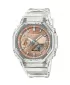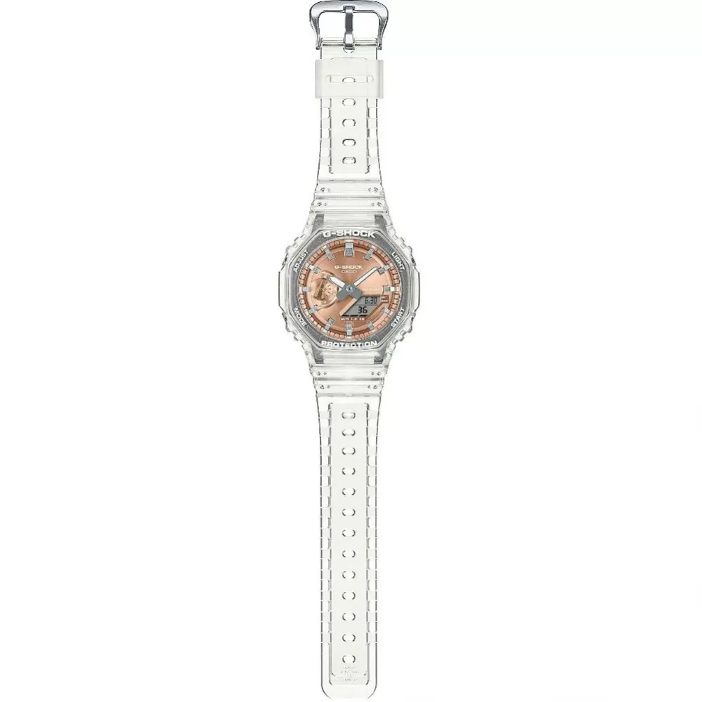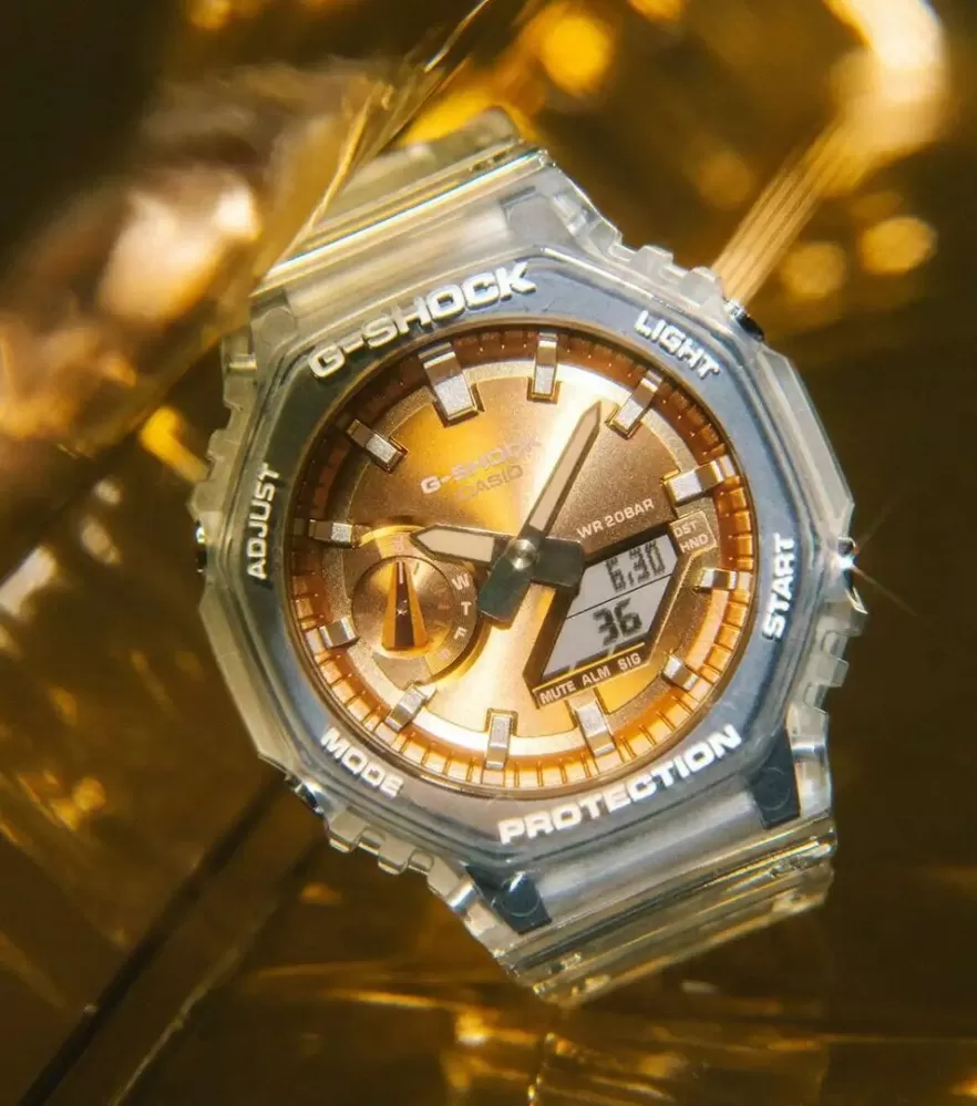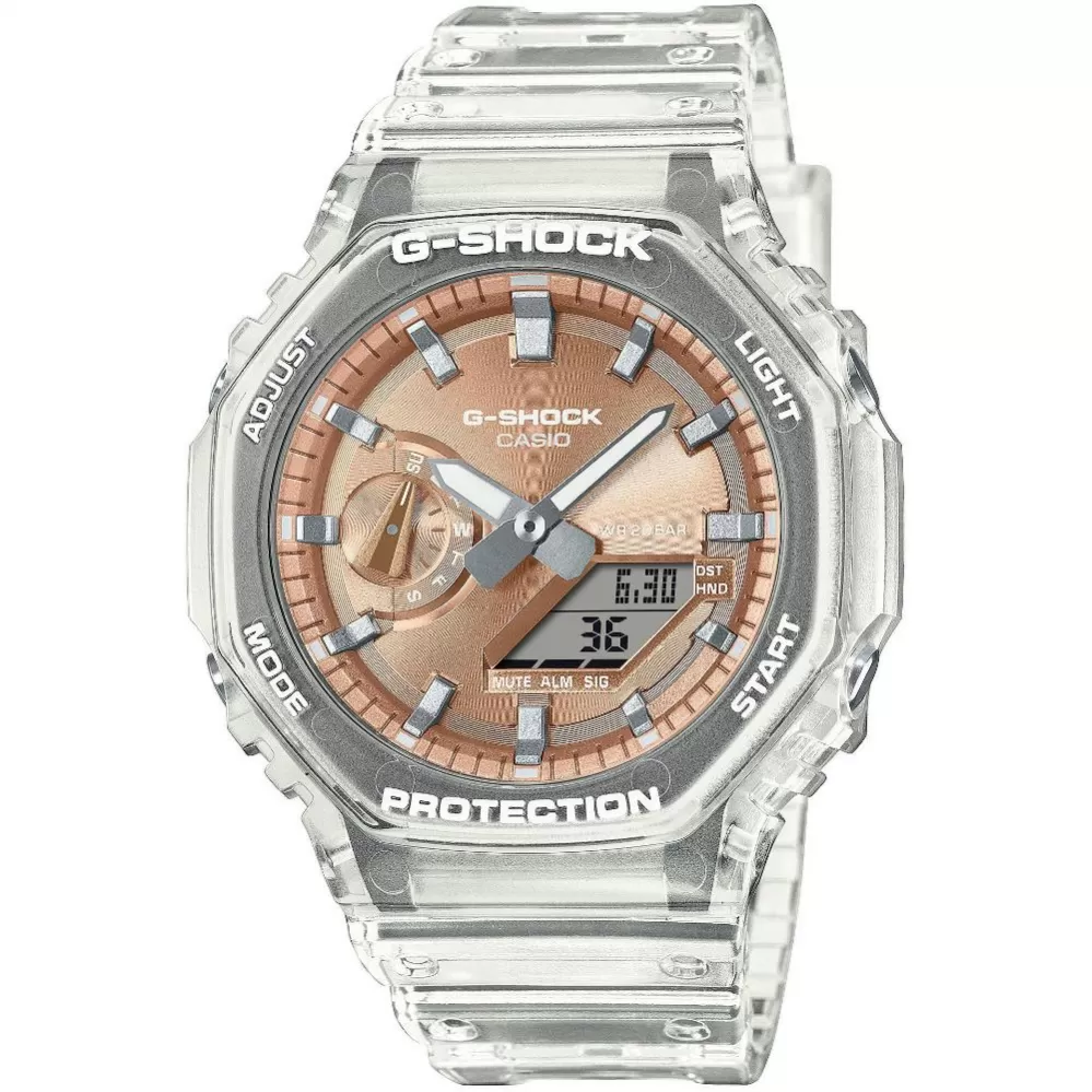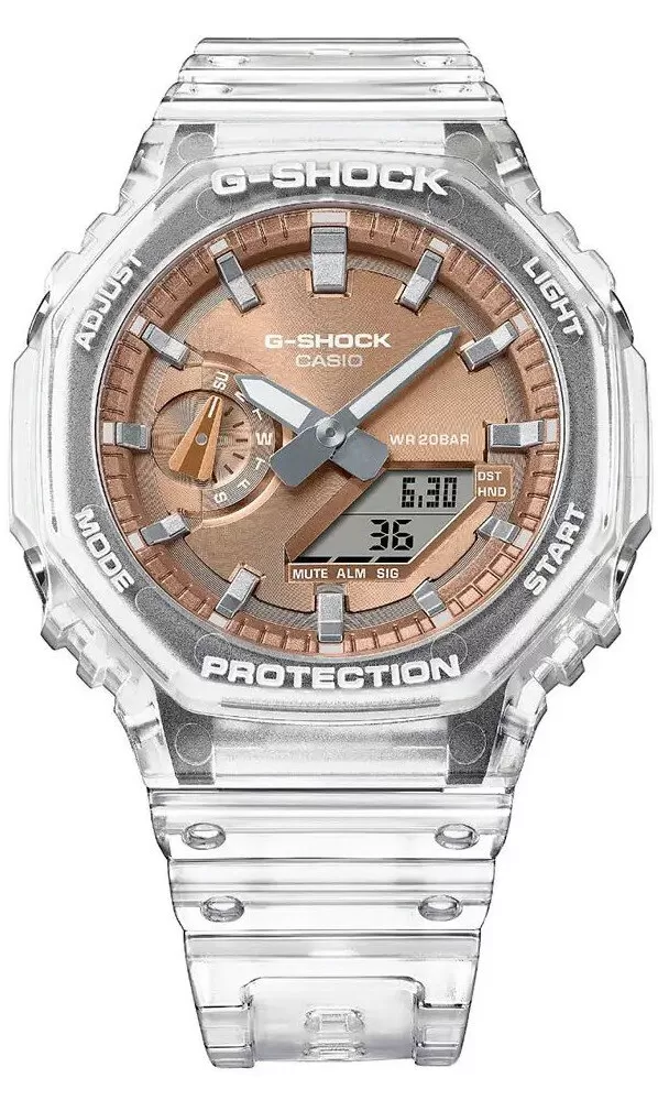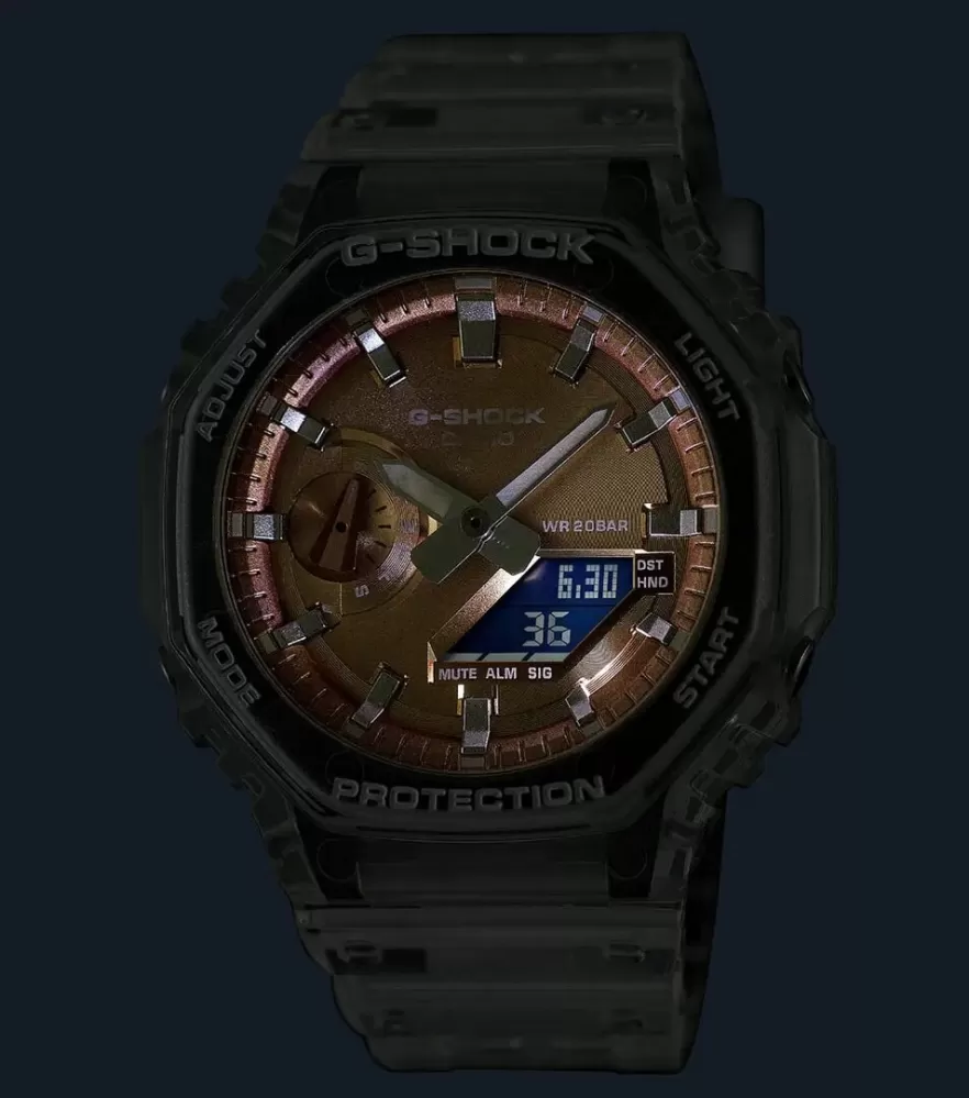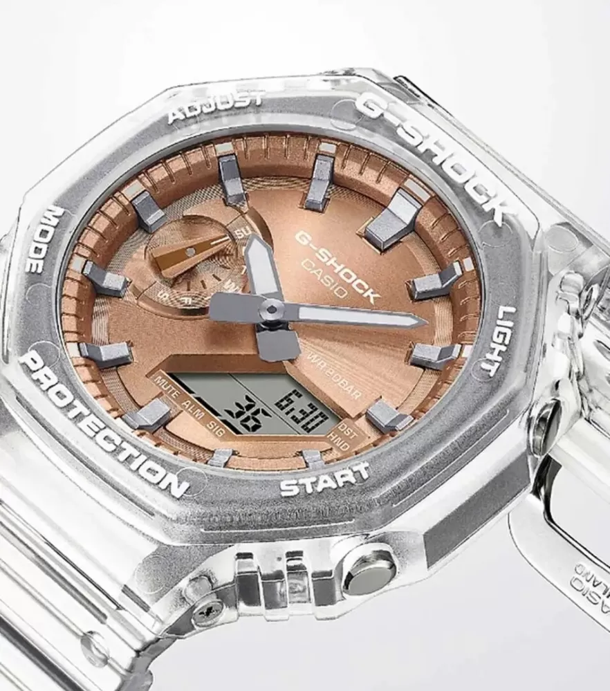 Casio G-Shock GA-2100BM-7A5ER přináší oblíbené metalické číselníky v kombinaci s populárním průhledným pouzdrem a náramkem. Hodinky mají současně tu nejvyšší odolnost. Vysoká odolnost pouzdra je zajištěna konstrukcí Carbon Core Guard. To je vyrobené z pryskyřice, vyztužené a zpevněné uhlíkovými vlákny, speciální je také konstrukce tlačítek, chránící model před průnikem nečistot. Zmíněná kombinace dovoluje vytvořit kompaktnější a lehčí celek.