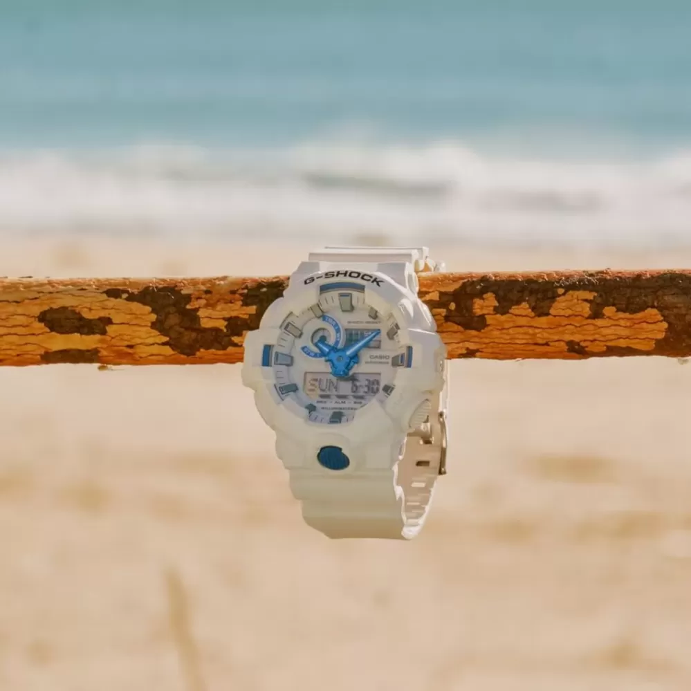 Casio G-Shock GA-700HDS-7AER Hidden Glow Series jsou novinkou ze série Hidden Glow Series, kde je společným prvkem luminiscenční prvky na číselnících. Modrý fosforeskující číselník hodinek v noci přímo magicky září.