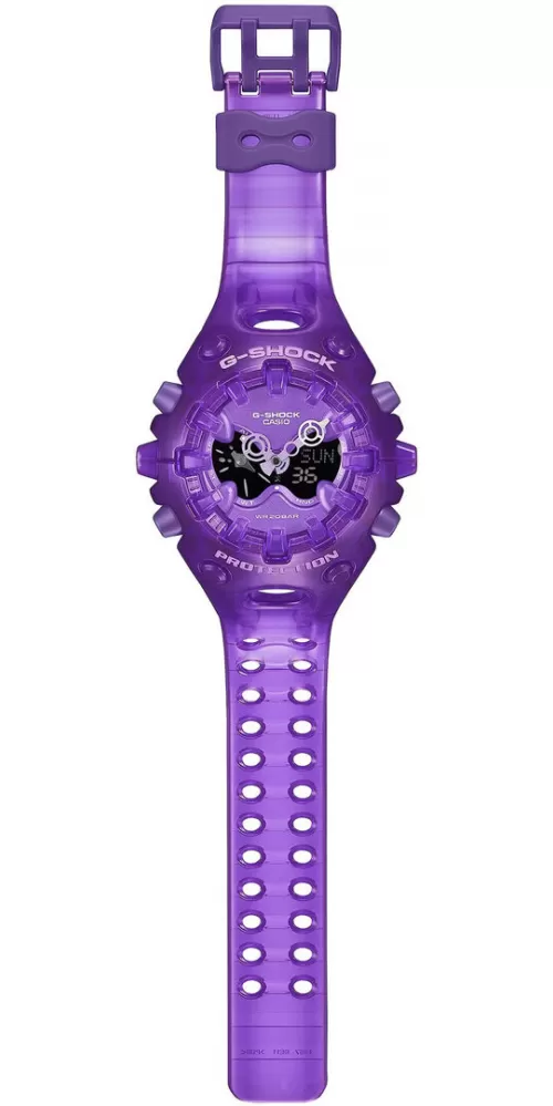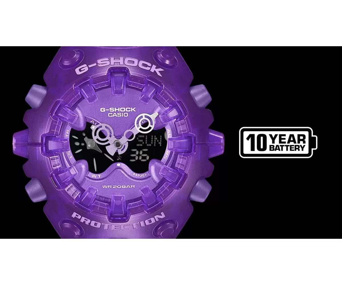 Casio G-Shock GA-V01SKE-6AER – futuristický transparentní design v fialovém provedení. Model GA-V01SKE-6AER přináší výrazně experimentální design, který posouvá hranice tradičního vzhledu G-Shock. Kombinuje organické tvary s ostrými technickými liniemi a doplňuje je o transparentní fialové provedení inspirované estetikou elektroniky přelomu tisíciletí (Y2K).