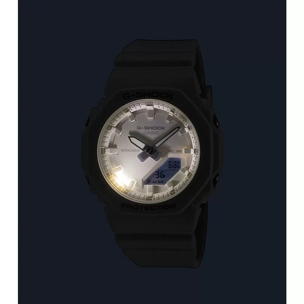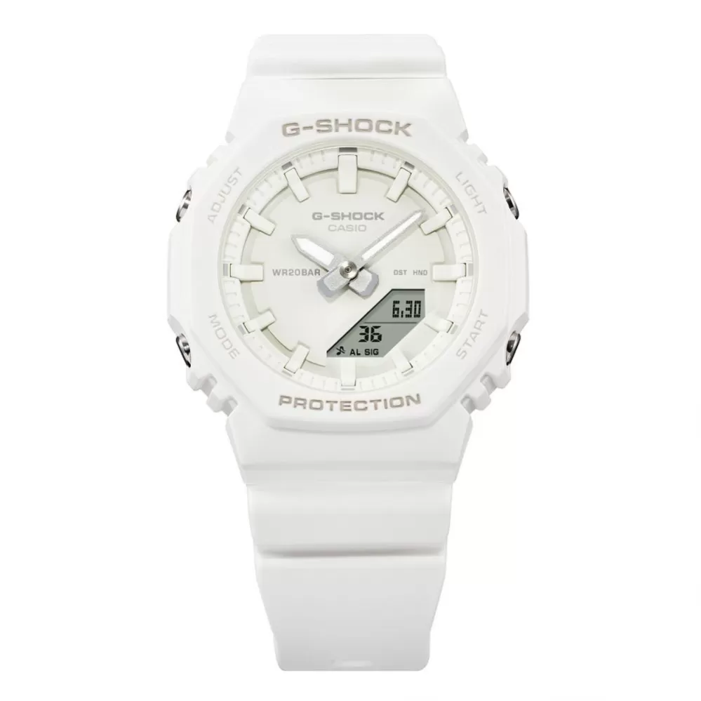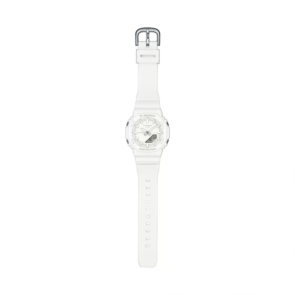 Dámské sportovní hodinky Casio G-Shock GMA-P2100-7AER ve velmi oblíbené kolekci dámských modelů CasiOak. Casio G-Shock GMA-P2100-7AER přichází nyní oblíbenou bílou barvu. Patří do trojice modelů v monochromatickém provedení. Zbylé dva modely jsou v tyrkysové a růžové barvě. Pouzdro, řemínek a dokonce i jednotlivé součásti číselníku jsou provedeny v jemně odlišných odstínech stejné barvy.