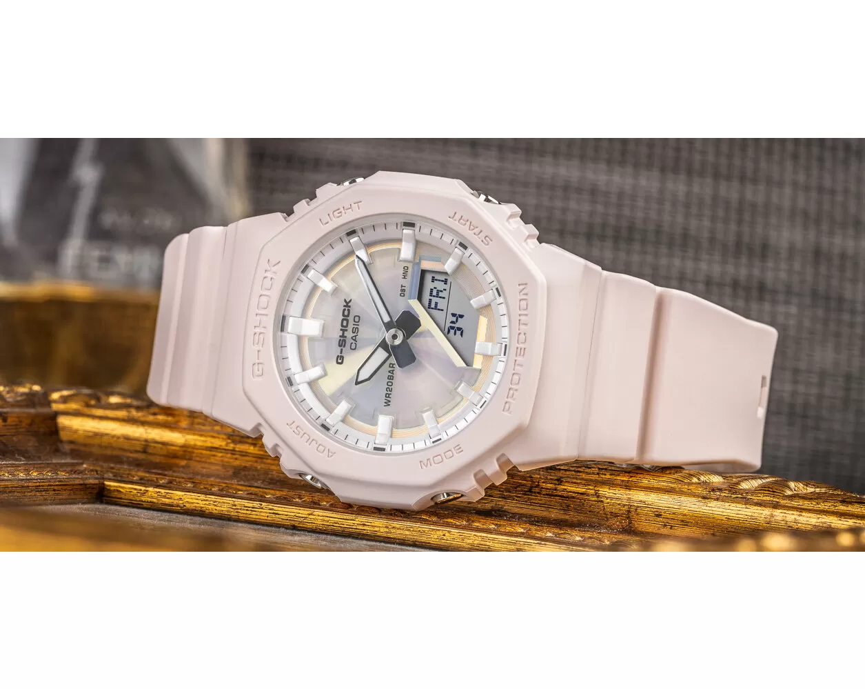 Casio G-Shock GMA-P2100PC-4AER – kompaktní odolnost s perleťovým efektem a růžovým ciferníkem. Model GMA-P2100PC-4AER přináší ikonický osmihranný design řady G-Shock v kompaktnějším a lehkém provedení, ideálním pro menší a středně velká zápěstí. Hodinky zaujmou světlým perleťovým pouzdrem, které v kombinaci s jemně růžovým ciferníkem působí svěže, moderně a velmi stylově.