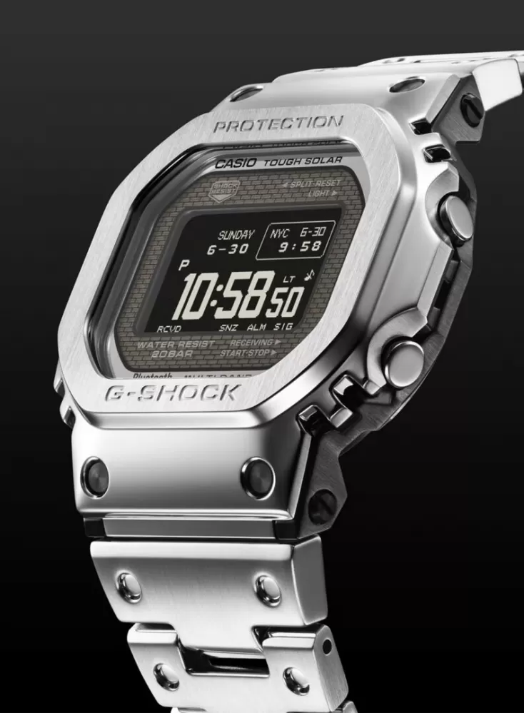 Zachovává hranatý tvar původního DW-5000, nyní však v luxusním kovovém zpracování s černým negativním displejem, který podtrhuje technický charakter hodinek.