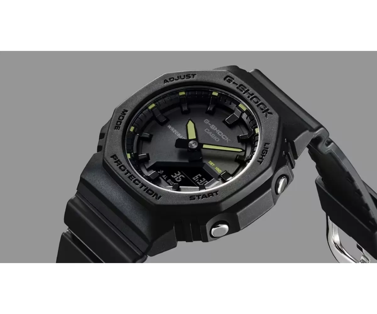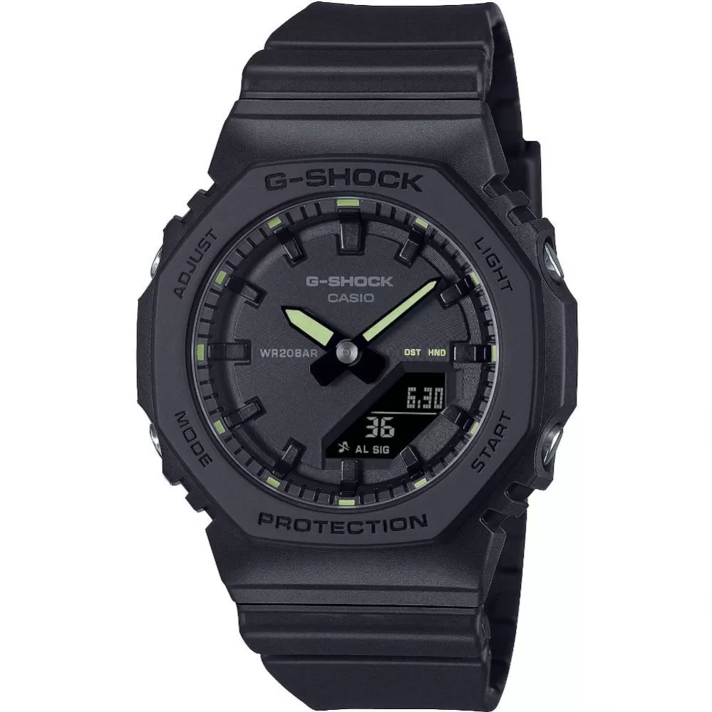 Casio G-Shock GMA-P2100SA-1A2ER se oblékly do černé barvy. Hodinky mají kombinovaný, analogový a digitální číselník, který zobrazuje datum, den v týdnu, stopky, budík a další funkce, které využijete při sportu a ve volném čase. Plastové pouzdro hodinek doplňuje pryžový řemínek vynikajícím vysokou odolností a dlouhou životností. Pouzdro i řemínek těchto hodinek jsou vyrobené z bio pryskyřice z obnovitelných organických zdrojů. Použité materiály pomohly snížit váhu hodinek na pouhých 40 gramů.