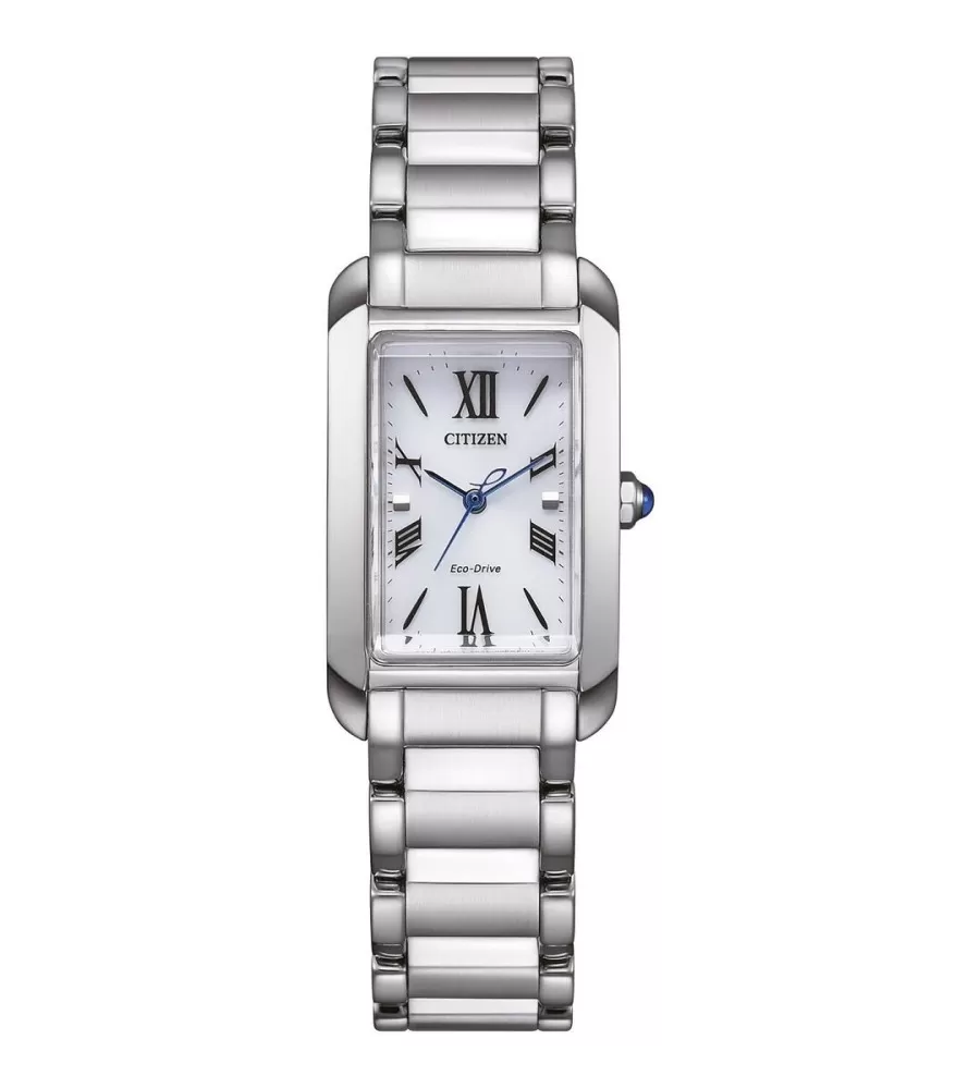 Dámské hodinky jsou poháněny technologii Eco-Drive, která využívá světlo jako zdroj energie. Pouzdro i tah je z nerezové ocele, který je hypoalergenní. Ciferník je svěží bílý s kombinací římských číslic a indexů. Sklo je z kvalitního safírového křišťálu, což zajišťuje vysokou odolnost proti poškrábání. Korunka je ozdobena syntetickým safírem.