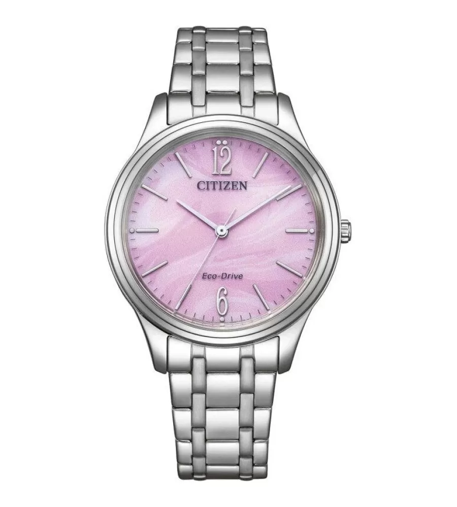 Tento model je poháněn technologií Eco-Drive, což znamená, že využívá světlo jako zdroj energie a není nutné měnit baterii. Ciferník je růžový s kombinací arabských číslic a jednoduchých indexů, ručky a prvky jsou stříbrné. Pouzdro je z nerezové oceli, kulaté s průměrem kolem 34 mm. Sklo nad ciferníkem je minerální a vodotěsnost je 50 m, což je dostačující pro běžné nošení.