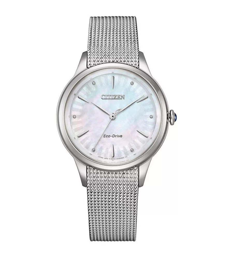 Tyto dámské hodinky jsou poháněny technologií Eco-Drive, která využívá světlo jako zdroj energie. Pouzdro je z nerezové oceli o průměru přibližně 32 mm. Ciferník má perleťový nádech v odstínu bílé barvy a doplněn je jednoduchými ryskami a tečkami místo indexů hodin. Vodotěsnost modelu je 50 m což znamená, že hodinky snesou stříkající vodu, mytí rukou či déšť, ale nejsou určeny pro plavání. Náramek hodinek je v milánském stylu s jemnou strukturou.