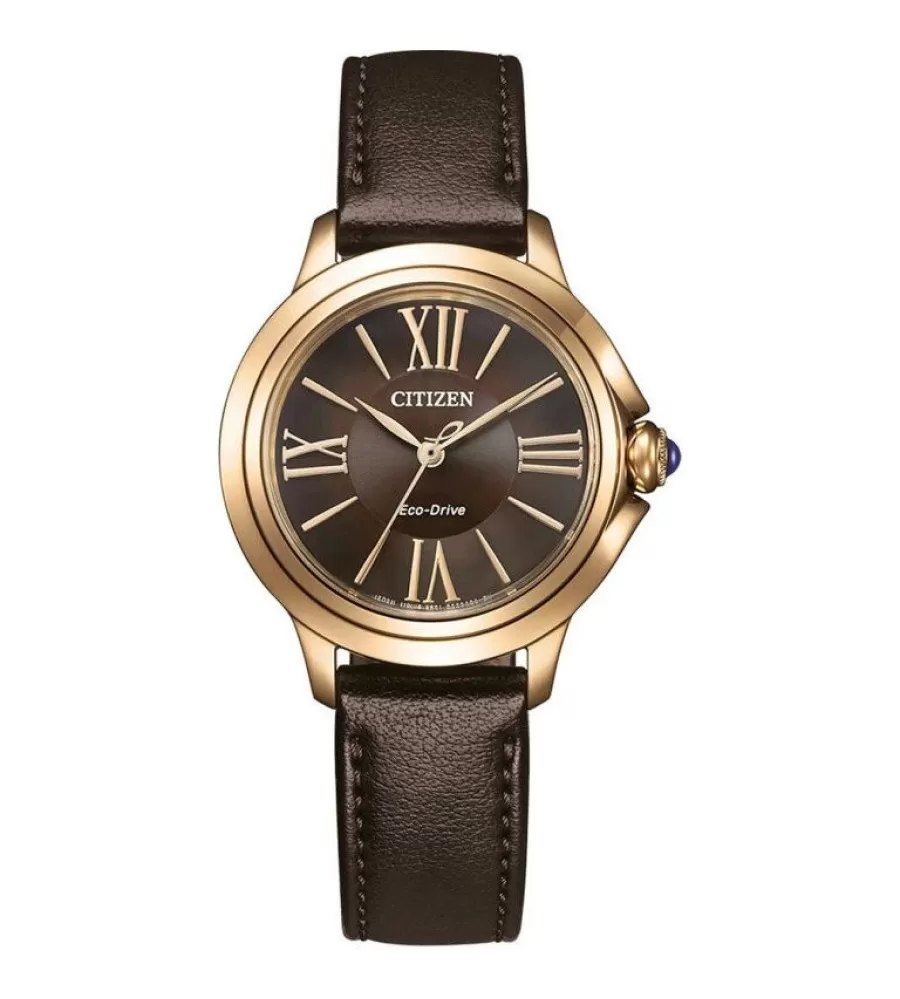 Tento model je poháněn technologií Eco-Drive, což znamená, že využívá světlo jako zdroj energie a není nutné měnit baterii. Pouzdro je z nerezové oceli opatřeno povrchovou úpravou v barvě žlutého zlata, a má průměr 32 mm. Ciferník je v hnědém odstínu s římskými číslicemi. Sklo je kulaté, safírové, což zajišťuje vysokou odolnost proti poškrábání. Řemínek je z materiálu Eco-Pet v hnědém odstínu a zapínání se spony s výsuvnými tlačítky.