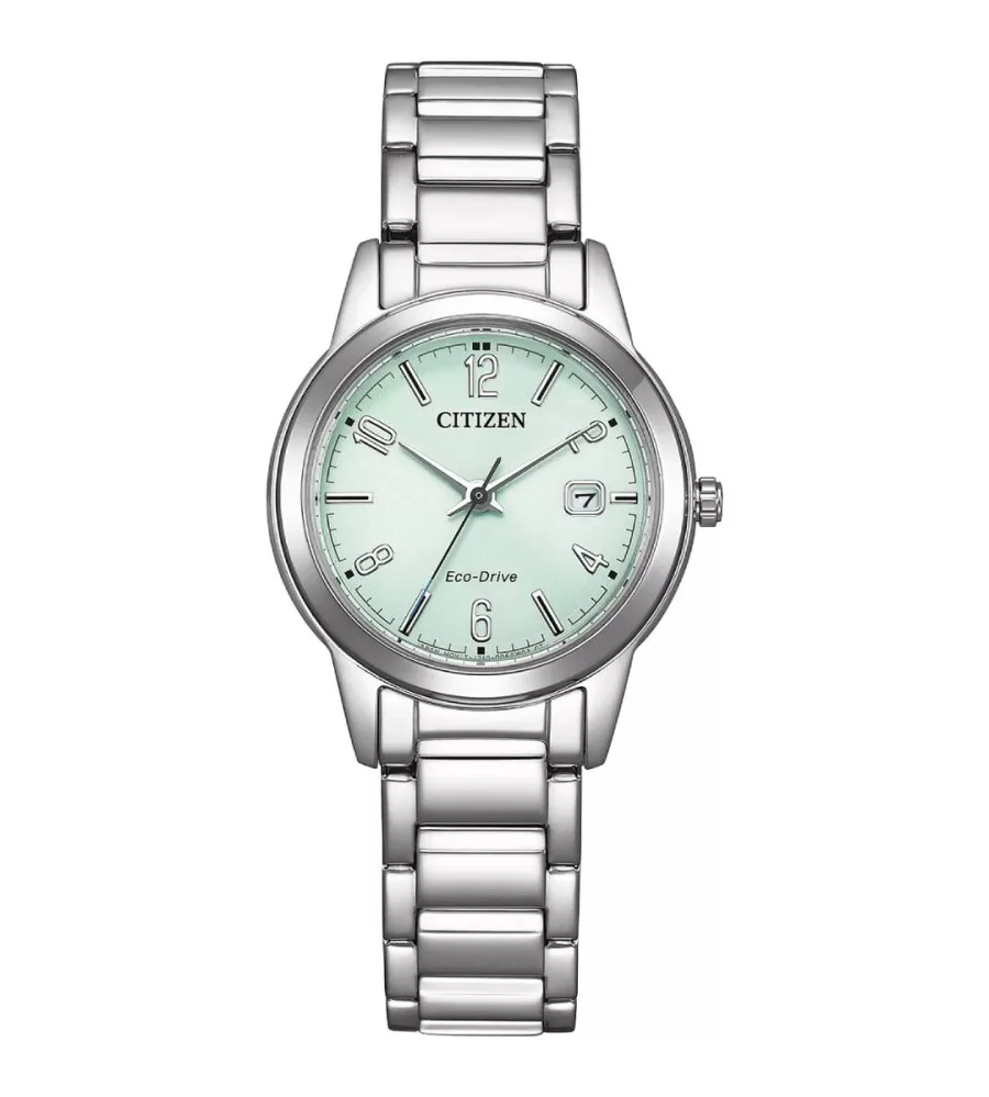 Model Citizen FE1241-71X jsou elegantní dámské hodinky s jemným a nadčasovým designem. Pouzdro i náramek jsou vyrobeny z nerezové oceli ve stříbrném provedení, díky čemuž působí univerzálně a hodí se ke každodennímu i formálnějšímu oblečení. Hodinky mají menší průměr okolo 29 mm, takže dobře sedí na užším zápěstí. Ciferník v zelené barvě se sunburst efektem dodává modelu moderní a lehce originální vzhled, přičemž zůstává přehledný a snadno čitelný. Nechybí ani praktické zobrazení data na pozici třetí hodiny.