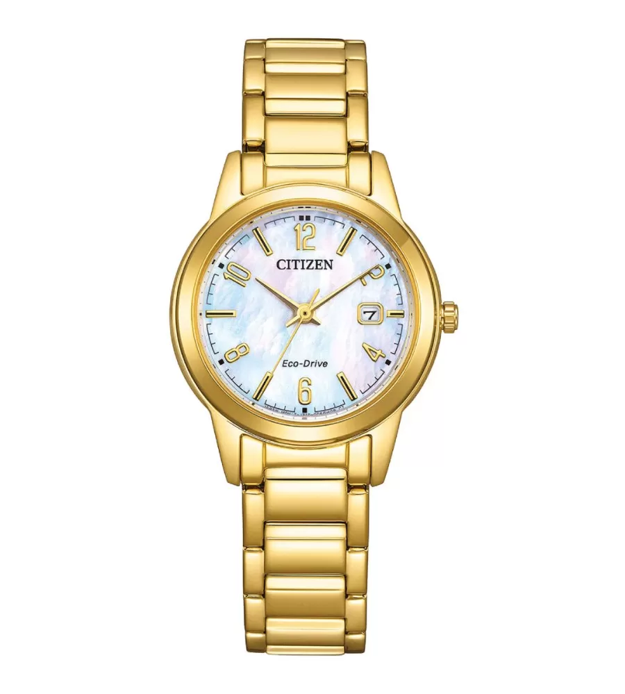 Citizen Ladies Classic FE1242‑78D jsou elegantní dámské hodinky značky Citizen, které kombinují klasický vzhled s moderní technologií Eco‑Drive. Hodinky mají pouzdro i náramek z ušlechtilé oceli s lesklou povrchovou úpravou v teplém zlatém odstínu, což jim dává nadčasově elegantní a ženský vzhled vhodný jak k dennímu nošení, tak i do společnosti.