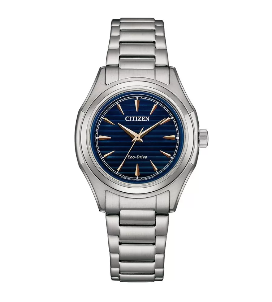 Model Citizen FE2110‑81L jsou dámské hodinky s klasickým a elegantním designem poháněné solární technologií Eco‑Drive, takže k životu používají světlo a není u nich třeba měnit baterii. Hodinky mají stříbrné pouzdro i náramek z nerezové oceli a kulatý ciferník v modré barvě, který je přehledný a minimalistický bez zbytečných zdobení, jen s ručičkami a indexy pro snadné odečítání času.