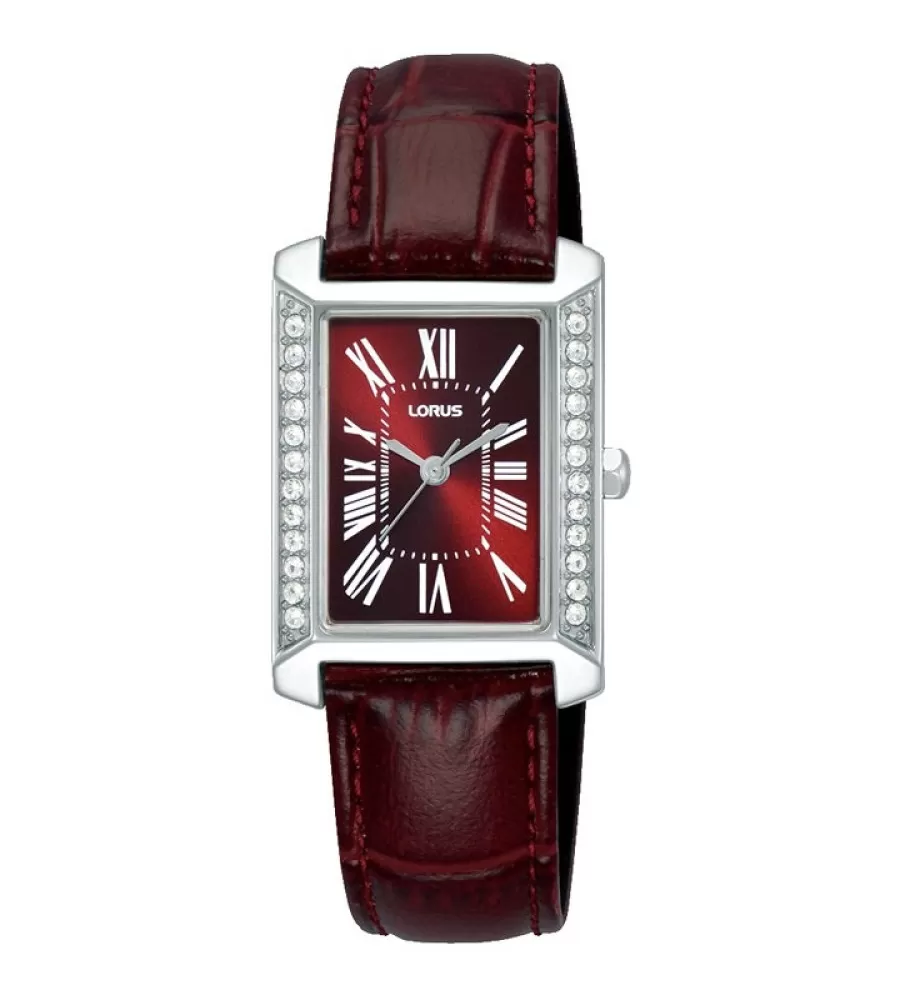 Dámské hodinky Lorus RG239YX9 zaujmou elegantním obdélníkovým pouzdrem z nerezové oceli, které je po stranách jemně zdobené třpytivými kamínky a dodává celku luxusní vzhled. Červený analogový ciferník s římskými číslicemi v bílé barvě působí velmi jemně a přehledně, přičemž je chráněn odolným minerálním sklíčkem. Kožený tah zajišťuje pohodlné nošení a elegantní dojem. Hodinky jsou osazeny spolehlivým quartzovým strojkem a disponují vodotěsností 5 ATM, která je vhodná pro běžný kontakt s vodou, například při mytí rukou či sprchování. Díky svému nadčasovému designu jsou ideální volbou pro každodenní nošení i slavnostnější příležitosti