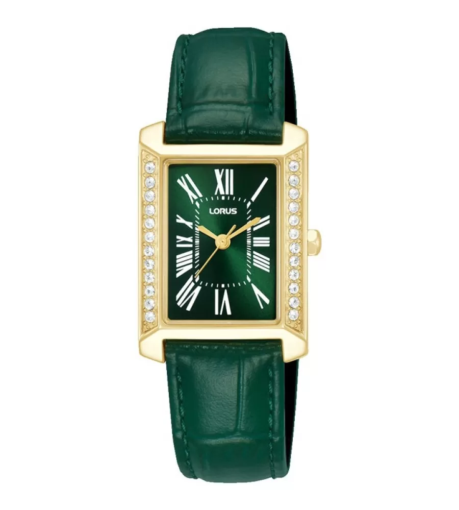Dámské hodinky Lorus RG242YX9 zaujmou elegantním obdélníkovým pouzdrem z nerezové oceli, které je po stranách jemně zdobené třpytivými kamínky a dodává celku luxusní vzhled. Zelený analogový ciferník s římskými číslicemi v bílé barvě působí velmi jemně a přehledně, přičemž je chráněn odolným minerálním sklíčkem. Kožený tah zajišťuje pohodlné nošení a elegantní dojem. Hodinky jsou osazeny spolehlivým quartzovým strojkem a disponují vodotěsností 5 ATM, která je vhodná pro běžný kontakt s vodou, například při mytí rukou či sprchování. Díky svému nadčasovému designu jsou ideální volbou pro každodenní nošení i slavnostnější příležitosti