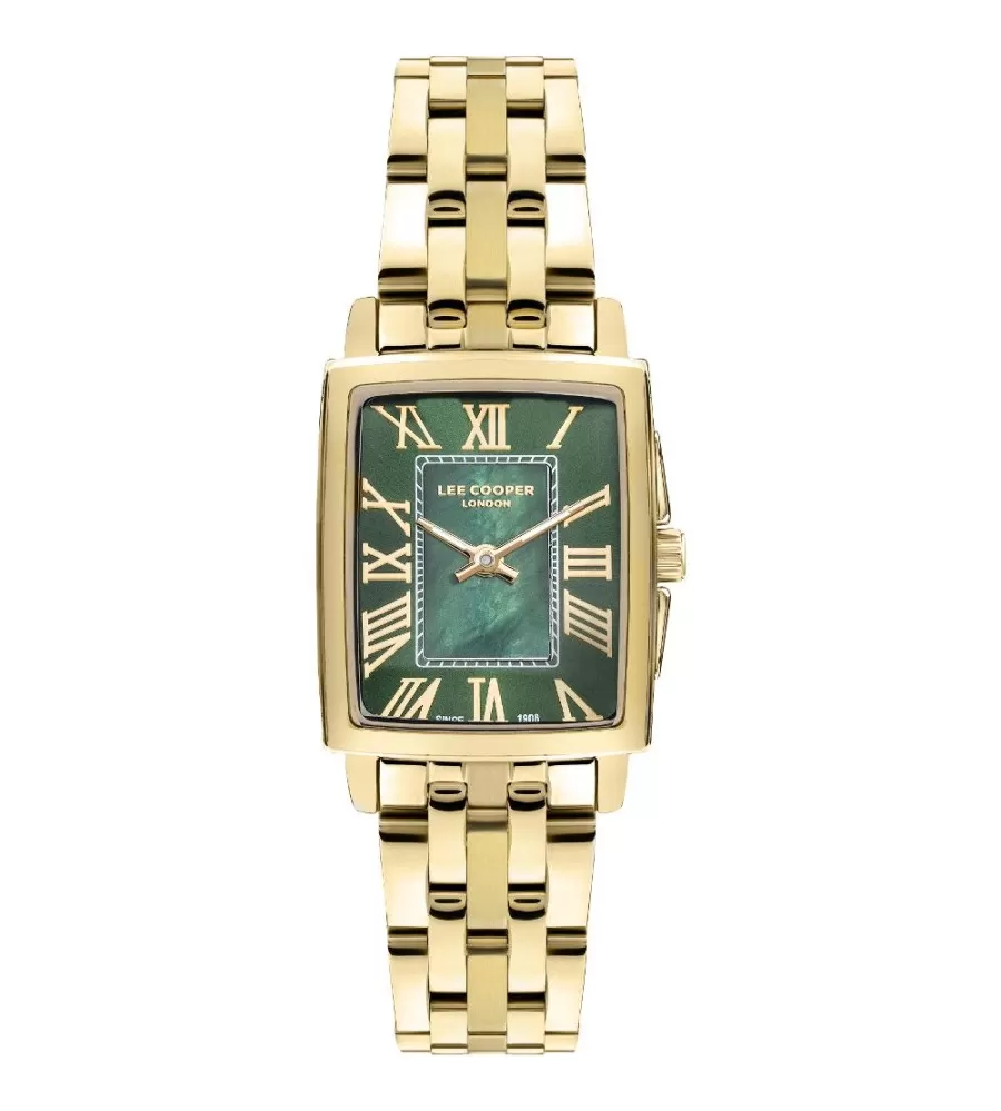 Dámské náramkové hodinky mají bateriový strojek a kovové pouzdro v hranatém tvaru o rozměru 32 mm v elegantní zlatavé barvě, doplněné zlatým kovovým tahem. Na zeleném ciferníku jsou římské číslice pro snadné a stylové čtení času. Čas je chráněn minerálním sklem a hodinky jsou odolné vůči vodě při běžném nošení.