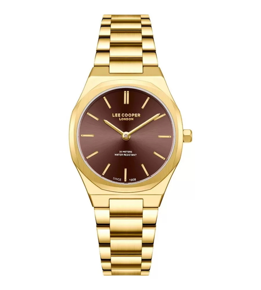 Model LC08276.140 jsou dámské náramkové hodinky značky Lee Cooper. Mají kulaté kovové pouzdro v zlaté barvě o průměru 33 mm. Ciferník je hnědý a je chráněn minerálním sklem. Hodinky pohání quartzový strojek napájený baterií. Zlatavý řemínek z kovu dodává hodinkám elegantní vzhled. Jsou odolné vůči běžnému kontaktu s vodou, například při mytí rukou. Tyto hodinky jsou vhodné pro ženy, které hledají kombinaci stylu a praktické funkčnosti.
