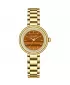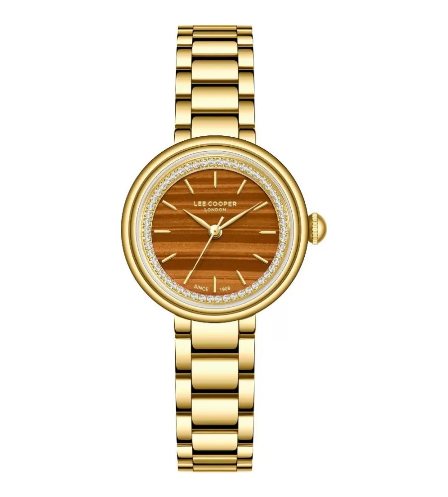 Dámské hodinky Lee Cooper LC08279.140 mají kulaté kovové pouzdro v zlaté barvě a ladící kovový náramek. Ciferník je hnědý s imitací dřeva, doplněný zlatými ručičkami a jemnými indexy. Hodinky pohání quartzový strojek na baterii a slouží pouze k zobrazení času bez dalších funkcí. Jsou elegantní a vhodné pro každodenní nošení o společenské akce.