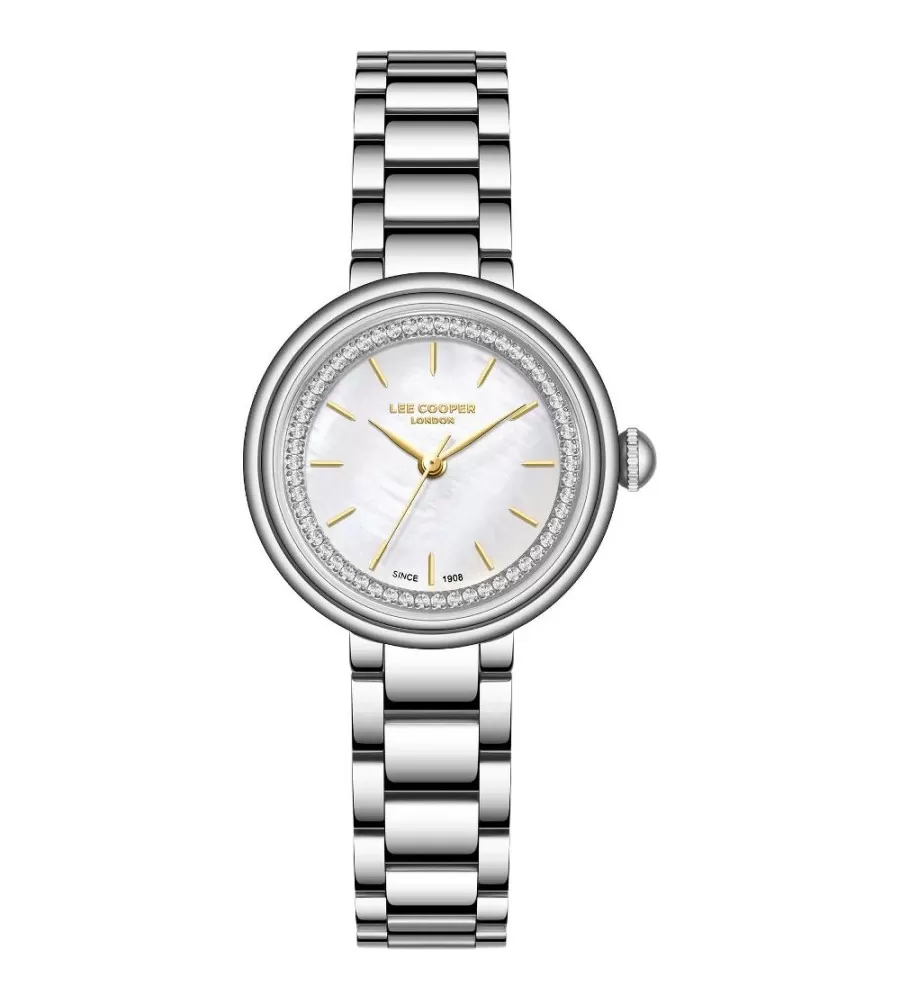 Dámské hodinky Lee Cooper LC08279.320 mají kulaté kovové pouzdro v stříbrné barvě a ladící kovový náramek. Ciferník je bílý s perleťovým efektem, doplněný zlatými ručičkami a jemnými indexy. Hodinky pohání quartzový strojek na baterii a slouží pouze k zobrazení času bez dalších funkcí. Jsou elegantní a vhodné pro každodenní nošení o společenské akce.