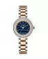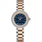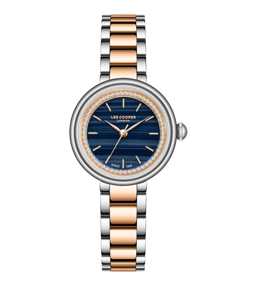 Dámské hodinky Lee Cooper LC08279.590 mají kulaté kovové pouzdro v kombinaci růžové a stříbrné barvě, ladící kovový náramek. Ciferník je v modré s imitací dřeva, doplněný zlatými ručičkami a jemnými indexy. Hodinky pohání quartzový strojek na baterii a slouží pouze k zobrazení času bez dalších funkcí. Jsou elegantní a vhodné pro každodenní nošení o společenské akce.