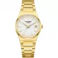 Dámské náramkové hodinky v klasickém designu jsou zhotoveny z kvalitního kovu ve zlatavém provedení. Hodinky mají hladké pouzdro, které doplňuje strukturovaný číselník a datumovka, umístěna na pozici třetí hodiny. Hodinky jsou vlhkotěsné a vhodné pro každodenní nošení.