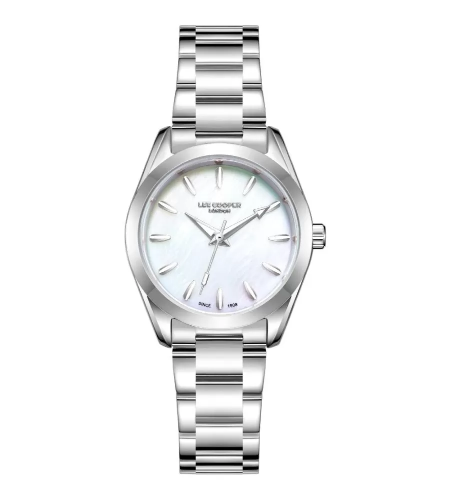 Dámské náramkové hodinky značky Lee Cooper, mají kulaté kovové pouzdro o průměru 32 mm. Ciferník v bílé barvě je chráněn minerálním sklem. Hodinky pohání quartzový strojek napájený baterií. Stříbrný řemínek z kovu dodává hodinkám elegantní vzhled. Jsou odolné vůči běžnému kontaktu s vodou, například při mytí rukou. Tyto hodinky jsou vhodné pro ženy, které hledají kombinaci stylu a praktické funkčnosti.