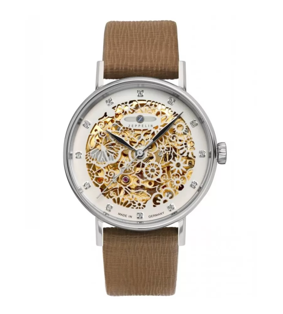 Hodinky Zeppelin 7461-5 Princess of the Sky jsou elegantní dámský model inspirovaný klasickým leteckým designem. Ciferník v světlém provedení je zdoben jemnými detaily a krystaly, které dodávají hodinkám luxusní a ženský vzhled. Pouzdro z nerezové oceli o velikosti 36 mm působí decentně a skvěle padne na dámské zápěstí. Hodinky pohání automatický strojek Miyota, který pracuje bez baterie a nabízí rezervu chodu přibližně 40–42 hodin. Model je doplněn kvalitním hnědým koženým řemínkem, který zajišťuje pohodlné nošení i elegantní vzhled. Minerální sklíčko chrání ciferník proti poškrábání a zachovává jeho dobrou čitelnost. Vodotěsnost 5 ATM umožňuje běžné každodenní používání včetně kontaktu s vodou. Díky kombinaci jemného designu a kvalitního zpracování jsou hodinky ideální jak pro společenské příležitosti, tak pro každodenní nošení.