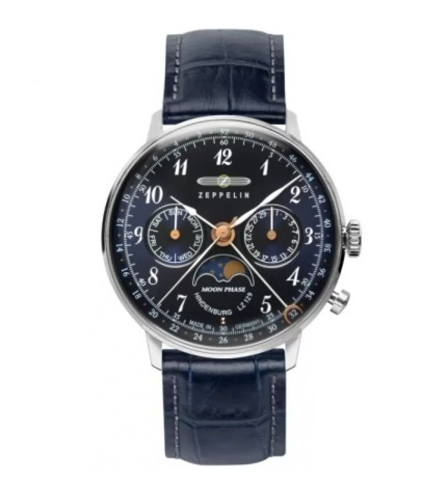 Hodinky Zeppelin 7037-3 představují ideální volbu pro ženy, které hledají spojení elegance a funkčnosti v leteckém stylu. Tyto německé dámské hodinky z modelové řady LZ 129 Hindenburg Mondphase vás okouzlí svým jemným modrým ciferníkem s arabskými číslicemi a precizním ručičkovým číselníkem.