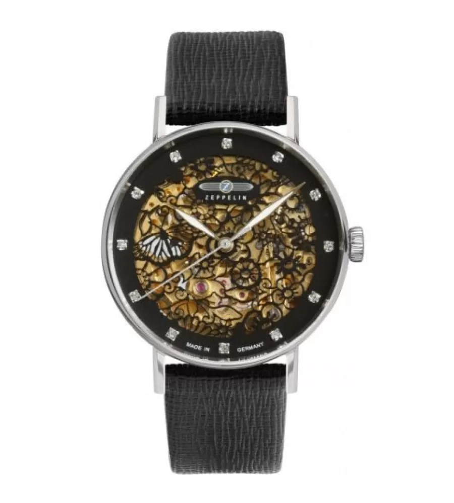 Hodinky Zeppelin 7461-2 z kolekce Princess of the Sky představují dokonalou kombinaci elegance a precizního německého řemeslného zpracování. Tyto dámské společenské hodinky zaujmou především svým černým ciferníkem zdobeným jemnými kamínky Swarovski, které dodávají celému modelu noblesní a luxusní vzhled.