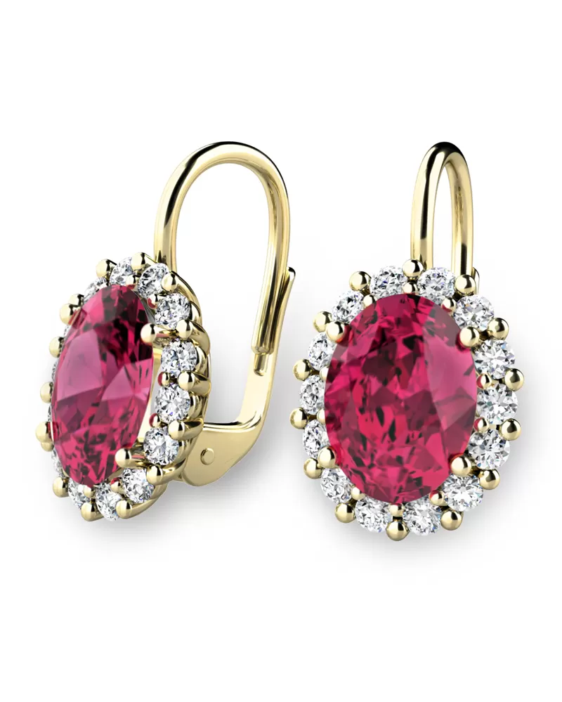 Nádherné luxusní dámské náušnice osázené středovými oválnými turmalíny a diamanty budou ideálním dárkem pro každou ženu. Náušnice jsou vyrobeny ze žlutého čtrnáctikarátového zlata - 585/1000 v lesklé povrchové úpravě. Vsazené diamanty jsou vybroušeny dokonalým briliantovým brusem, díky kterému dokonale odráží světlo a jejich brilance neuvěřitelné září z každého úhlu pohledu! Všechny kameny jsou pevně uchyceny krapnami. Vsazování diamantů a drahých kamenů provádějí naši nejzkušenější mistři zlatníci ručně pod mikroskopem s přesností na 0,01mm a proto nehrozí vypadnutí kamínků jako to bývá u strojně vyráběných náušnic. Celé náušnice působí dokonalým a luxusním dojmem!
