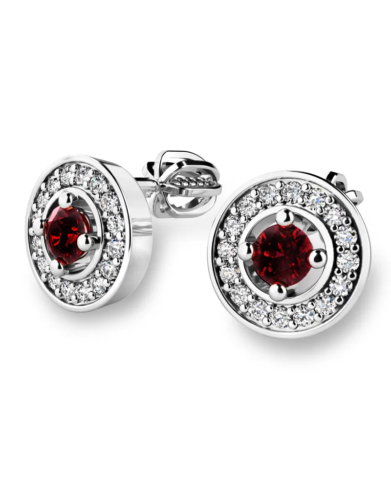 Nádherné luxusní dámské náušnice pecky osázené středovým granátem a diamanty budou ideálním dárkem pro každou ženu. Náušnice jsou vyrobeny z bílého čtrnáctikarátového zlata - 585/1000 v lesklé povrchové úpravě. Vsazené diamanty jsou vybroušeny dokonalým briliantovým brusem, díky kterému dokonale odráží světlo a jejich brilance neuvěřitelné září z každého úhlu pohledu! Všechny kameny jsou pevně uchyceny krapnami. Vsazování diamantů a drahých kamenů provádějí naši nejzkušenější mistři zlatníci ručně pod mikroskopem s přesností na 0,01mm a proto nehrozí vypadnutí kamínků jako to bývá u strojně vyráběných náušnic. Celé náušnice působí dokonalým a luxusním dojmem! Náušnice se zapínají na šroubek. Šroubek pro balónek je umístěný cca 2 mm pod horní okraj náušnice a tedy krásně zakrývá dírku v uchu.