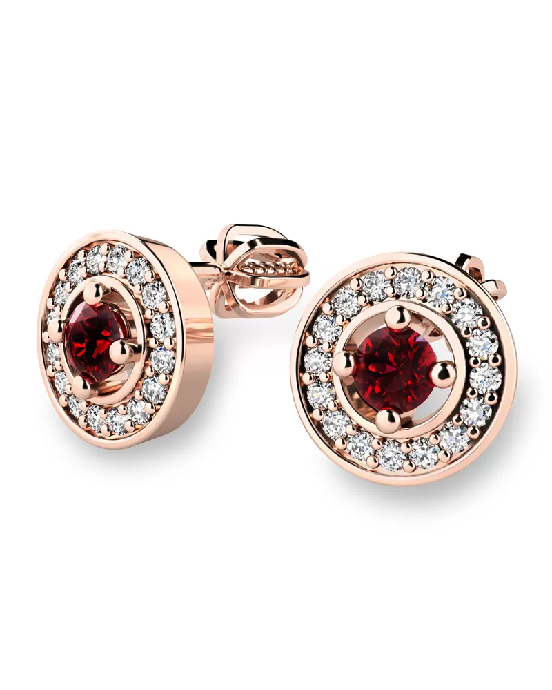 Nádherné luxusní dámské náušnice pecky osázené středovým granátem a diamanty budou ideálním dárkem pro každou ženu. Náušnice jsou vyrobeny z růžového čtrnáctikarátového zlata - 585/1000 v lesklé povrchové úpravě. Vsazené diamanty jsou vybroušeny dokonalým briliantovým brusem, díky kterému dokonale odráží světlo a jejich brilance neuvěřitelné září z každého úhlu pohledu! Všechny kameny jsou pevně uchyceny krapnami. Vsazování diamantů a drahých kamenů provádějí naši nejzkušenější mistři zlatníci ručně pod mikroskopem s přesností na 0,01mm a proto nehrozí vypadnutí kamínků jako to bývá u strojně vyráběných náušnic. Celé náušnice působí dokonalým a luxusním dojmem! Náušnice se zapínají na šroubek. Šroubek pro balónek je umístěný cca 2 mm pod horní okraj náušnice a tedy krásně zakrývá dírku v uchu.