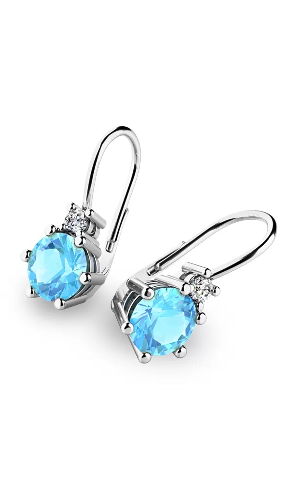 Krásné a elegantní dámské náušnice jsou vyrobené z bílého čtrnácti karátového zlata o ryzosti 585/1000 s lesklou povrchovou úpravou. Náušnice zdobí dva nádherné topazy ve světle modré - swiss blue barvě a dva menší diamanty vsazené nad topazy. Topazy i diamanty jsou broušeny do briliantového tvaru, který zaručuje maximální lesk kamenů a celého šperku.