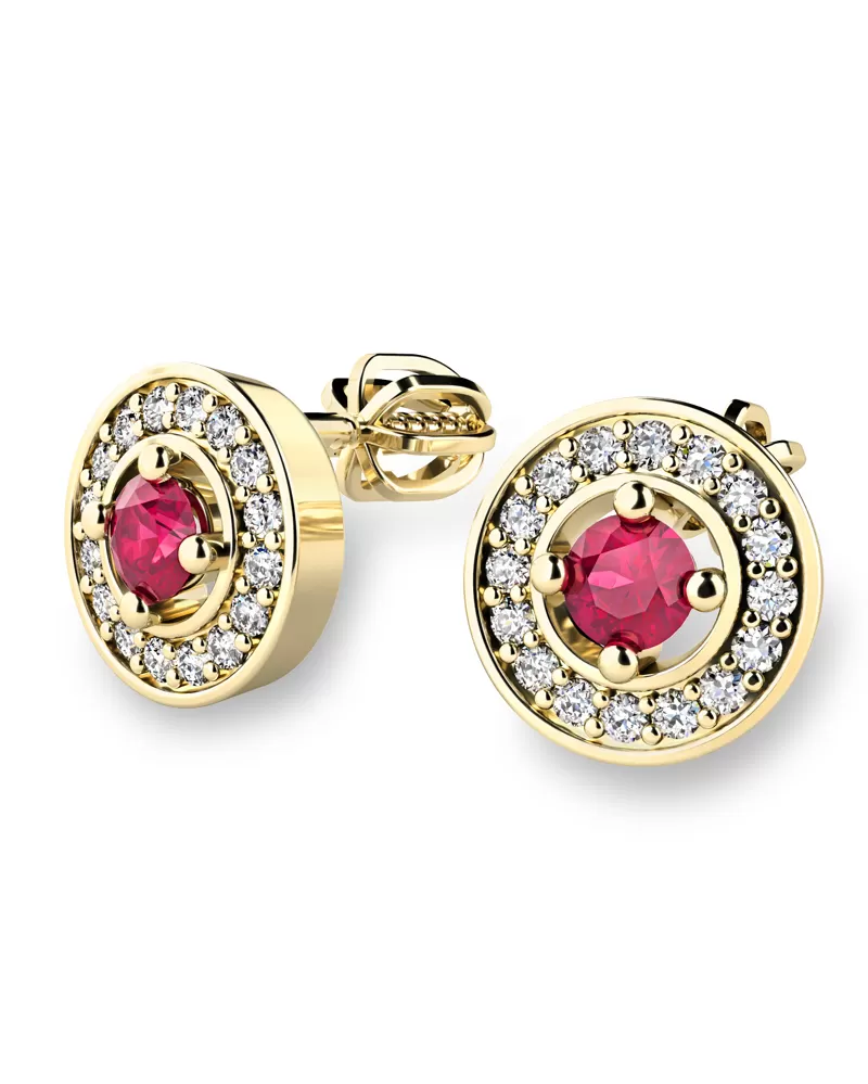 Nádherné luxusní dámské náušnice pecky osázené středovým rubínem a diamanty budou ideálním dárkem pro každou ženu. Náušnice jsou vyrobeny ze žlutého čtrnáctikarátového zlata - 585/1000 v lesklé povrchové úpravě. Vsazené diamanty jsou vybroušeny dokonalým briliantovým brusem, díky kterému dokonale odráží světlo a jejich brilance neuvěřitelné září z každého úhlu pohledu!  Všechny kameny jsou pevně uchyceny krapnami. Vsazování diamantů a drahých kamenů provádějí naši nejzkušenější mistři zlatníci ručně pod mikroskopem s přesností na 0,01mm a proto nehrozí vypadnutí kamínků jako to bývá u strojně vyráběných náušnic. Celé náušnice působí dokonalým a luxusním dojmem! Náušnice se zapínají na šroubek. Šroubek pro balónek je umístěný cca 2 mm pod horní okraj náušnice a tedy krásně zakrývá dírku v uchu.