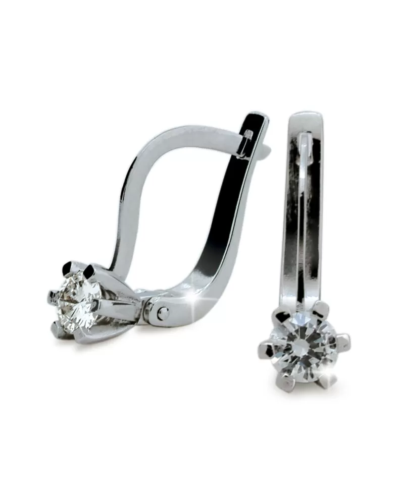 Klasické dámské visací náušnice jsou zdobeny diamantem v briliantovém brusu. Diamant je precizně uchycen šesti krapnami. Tyto náušnice jsou vyrobeny z bílého čtrnáctikarátového zlata - 585/1000 v lesklé povrchové úpravě. Vsazování diamantů provádějí naši nejzkušenější mistři zlatníci ručně pod mikroskopem s přesností na 0,01 mm a proto nehrozí vypadnutí kamínků jako to bývá u strojně vyráběných náušnic. Zapínání náušnic je na klapky.