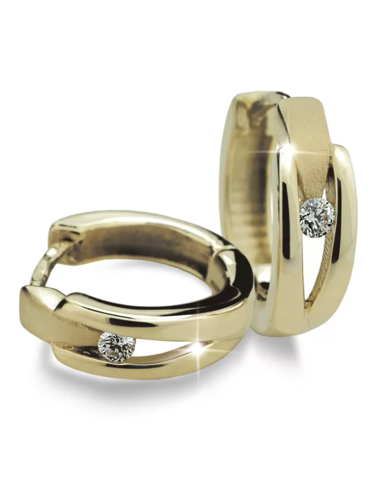 Náušnice kruhy patří mezi vůbec nejoblíbenější typ náušnic, Náušnice jsou vhodné pro každodenní nošení i na společenské akce a sluší každé ženě! Tyto elegantní kruhy jsou vyrobeny ze žlutého čtrnáctikarátového zlata - 585/1000 v kombinaci lesklé a matné povrchové úpravy. V náušnicích jsou vsazeny dva kulaté diamanty v briliantovém brusu, díky kterému dokonale odráží světlo a neuvěřitelné září.