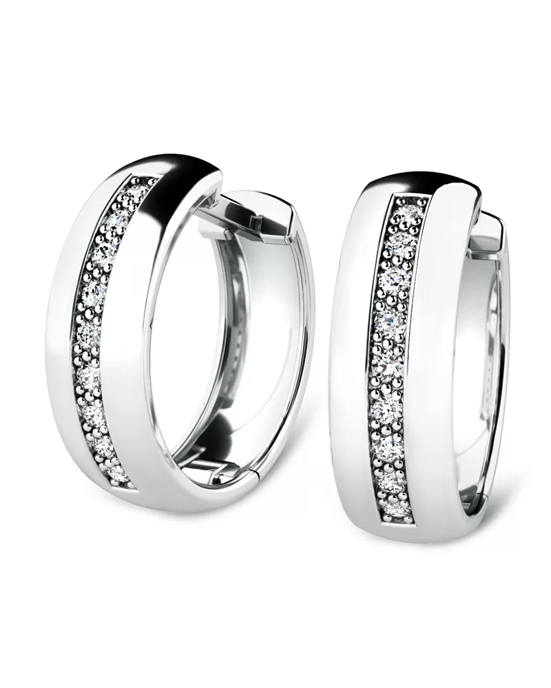 Náušnice kruhy patří mezi vůbec nejoblíbenější typ náušnic, náušnice jsou vhodné pro každodenní nošení i na společenské akce a sluší každé ženě! Jsou vyrobeny z bílého čtrnáctikarátového zlata - 585/1000 v lesklé povrchové úpravě. V každé náušnici je vsazeno "do zrnek" devět kulatých diamantů, vybroušený kulatým briliantovým brusem, který zajišťuje maximální brilanci vybroušených facet ze všech úhlů pohledu! Vsazování diamantů provádějí naši nejzkušenější mistři zlatníci ručně pod mikroskopem s přesností na 0,01mm a proto nehrozí vypadnutí diamantů jako to bývá u strojně vyráběných šperků. Náušnice jsou středně velké, na uchu vypadají elegantně a přirozeně!