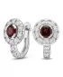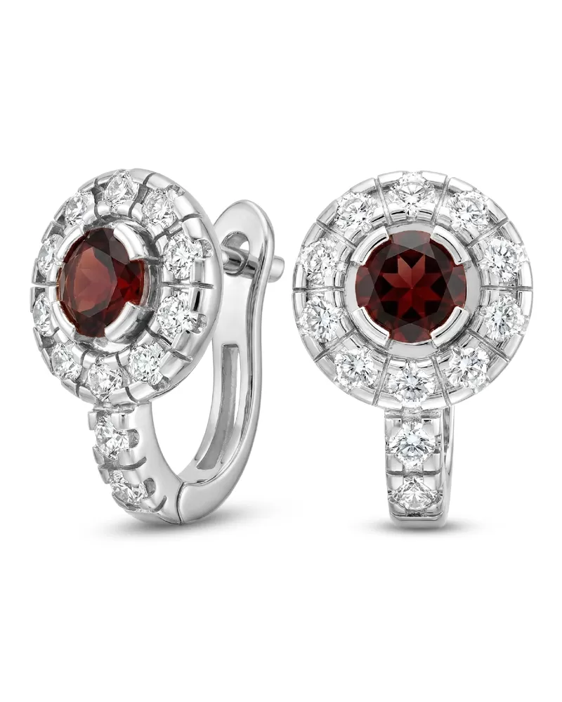 Náušnice typu "podkovičky" patří mezi velmi oblíbené typy náušnic, náušnice jsou vhodné pro každodenní nošení i na společenské akce a sluší každé ženě! Jsou vyrobeny z bílého čtrnáctikarátového zlata - 585/1000 v lesklé povrchové úpravě. V náušnicích je vsazeno "do krapniček" dvacetčtyři menších diamantů a dva větší centrální granáty. Všechny kameny jsou vybroušeny kulatým briliantovým brusem, který zajišťuje maximální brilanci vybroušených facet a krásně září ze všech úhlů pohledu! Vsazování diamantů a drahokamů provádějí naši nejzkušenější mistři zlatníci ručně pod mikroskopem s přesností na 0,01mm a proto nehrozí vypadnutí diamantů jako to bývá u strojně vyráběných šperků. Náušnice jsou středně velké, na uchu vypadají elegantně a přirozeně a díky skladbě a stylově čistému vsazení diamantů vynikají krásnou brilancí kamenů!