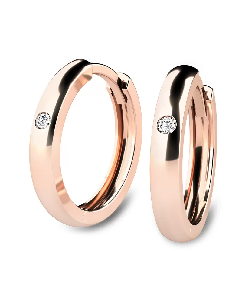 Náušnice kruhy - patří mezi vůbec nejoblíbenější typ náušnic, náušnice jsou vhodné pro každodenní nošení i na společenské akce a sluší každé ženě! Jsou vyrobeny z růžového čtrnáctikarátového zlata - 585/1000 v lesklé povrchové úpravě. V náušnicích jsou zatepány "na hladko" dva kulaté přírodní diamanty, vybroušené kulatým briliantovým brusem, který zajišťuje maximální brilanci vybroušených facet ze všech úhlů pohledu! Vsazování diamantů provádějí naši nejzkušenější mistři zlatníci ručně pod mikroskopem s přesností na 0,01mm a proto nehrozí vypadnutí diamantů jako to bývá u strojně vyráběných šperků. Náušnice působí jemným a elegantním dojmem!