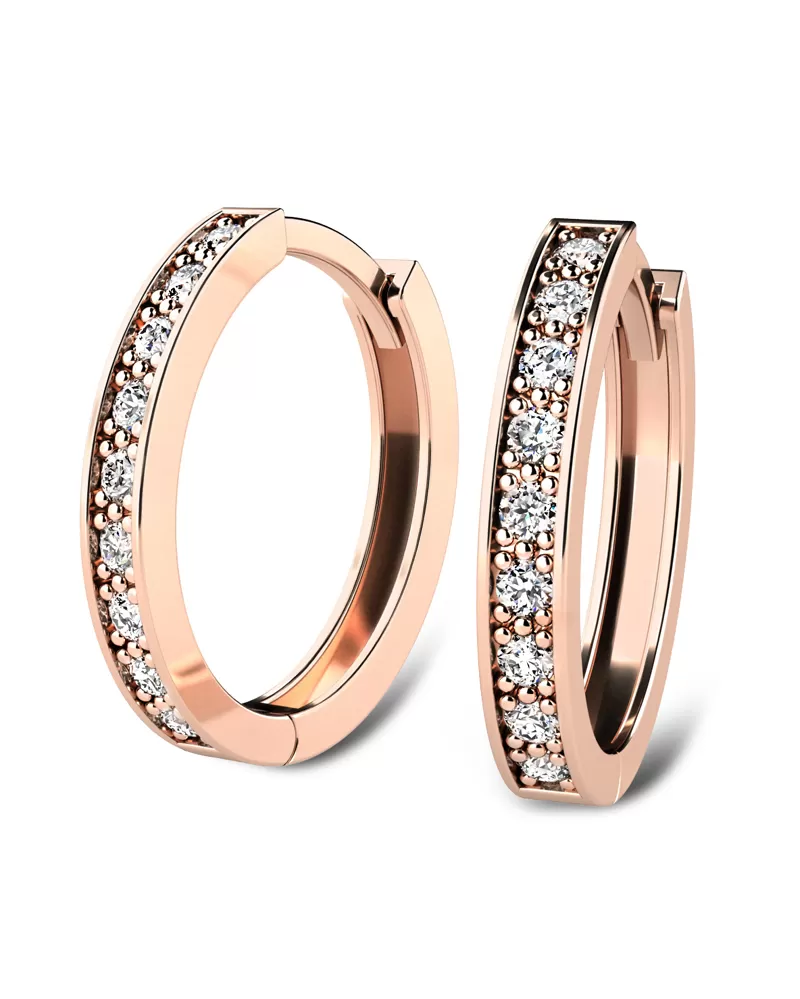 Náušnice kruhy - v tomto případě oválky, patří mezi vůbec nejoblíbenější typ náušnic, náušnice jsou vhodné pro každodenní nošení i na společenské akce a sluší každé ženě! Jsou vyrobeny z růžového čtrnáctikarátového zlata - 585/1000 v lesklé povrchové úpravě. V náušnicích je vsazeno "do zrnek" osmnáct kulatých přírodních diamantů, vybroušených kulatým briliantovým brusem, který zajišťuje maximální brilanci vybroušených facet ze všech úhlů pohledu! Vsazování diamantů provádějí naši nejzkušenější mistři zlatníci ručně pod mikroskopem s přesností na 0,01mm a proto nehrozí vypadnutí diamantů jako to bývá u strojně vyráběných šperků. Náušnice působí elegantním dojmem!