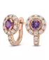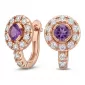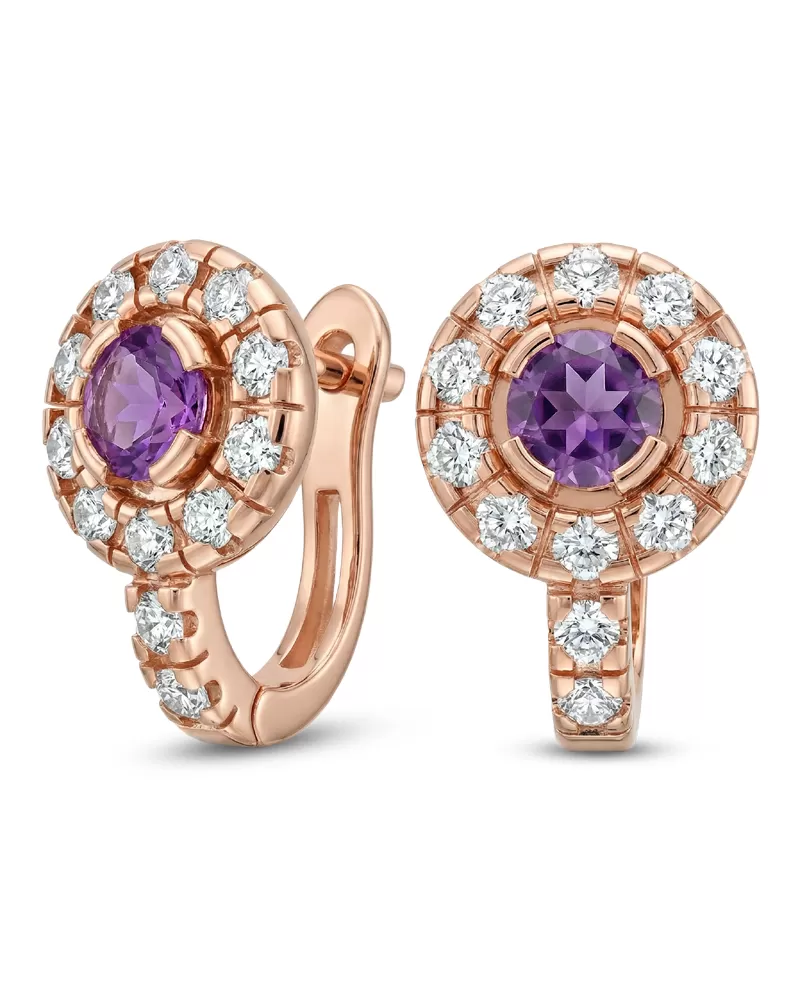 Náušnice typu "podkovičky" patří mezi velmi oblíbené typy náušnic, náušnice jsou vhodné pro každodenní nošení i na společenské akce a sluší každé ženě! Jsou vyrobeny z růžového čtrnáctikarátového zlata - 585/1000 v lesklé povrchové úpravě. V náušnicích je vsazeno "do krapniček" dvacetčtyři menších diamantů a dva větší centrální ametysty. Všechny kameny jsou vybroušeny kulatým briliantovým brusem, který zajišťuje maximální brilanci vybroušených facet a krásně září ze všech úhlů pohledu! Vsazování diamantů a drahokamů provádějí naši nejzkušenější mistři zlatníci ručně pod mikroskopem s přesností na 0,01mm a proto nehrozí vypadnutí diamantů jako to bývá u strojně vyráběných šperků. Náušnice jsou středně velké, na uchu vypadají elegantně a přirozeně a díky skladbě a stylově čistému vsazení diamantů vynikají krásnou brilancí kamenů!