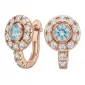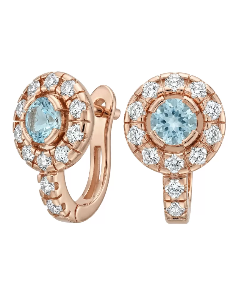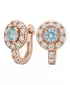 Náušnice typu "podkovičky" patří mezi velmi oblíbené typy náušnic, náušnice jsou vhodné pro každodenní nošení i na společenské akce a sluší každé ženě! Jsou vyrobeny z růžového čtrnáctikarátového zlata - 585/1000 v lesklé povrchové úpravě. V náušnicích je vsazeno "do krapniček" dvacetčtyři menších diamantů a dva větší centrální topazy v barvě Swiss blue. Všechny kameny jsou vybroušeny kulatým briliantovým brusem, který zajišťuje maximální brilanci vybroušených facet a krásně září ze všech úhlů pohledu! Vsazování diamantů a drahokamů provádějí naši nejzkušenější mistři zlatníci ručně pod mikroskopem s přesností na 0,01mm a proto nehrozí vypadnutí diamantů jako to bývá u strojně vyráběných šperků. Náušnice jsou středně velké, na uchu vypadají elegantně a přirozeně a díky skladbě a stylově čistému vsazení diamantů vynikají krásnou brilancí kamenů!