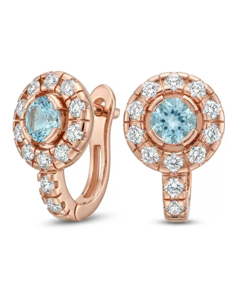 Náušnice typu "podkovičky" patří mezi velmi oblíbené typy náušnic, náušnice jsou vhodné pro každodenní nošení i na společenské akce a sluší každé ženě! Jsou vyrobeny z růžového čtrnáctikarátového zlata - 585/1000 v lesklé povrchové úpravě. V náušnicích je vsazeno "do krapniček" dvacetčtyři menších diamantů a dva větší centrální topazy v barvě Swiss blue. Všechny kameny jsou vybroušeny kulatým briliantovým brusem, který zajišťuje maximální brilanci vybroušených facet a krásně září ze všech úhlů pohledu! Vsazování diamantů a drahokamů provádějí naši nejzkušenější mistři zlatníci ručně pod mikroskopem s přesností na 0,01mm a proto nehrozí vypadnutí diamantů jako to bývá u strojně vyráběných šperků. Náušnice jsou středně velké, na uchu vypadají elegantně a přirozeně a díky skladbě a stylově čistému vsazení diamantů vynikají krásnou brilancí kamenů!