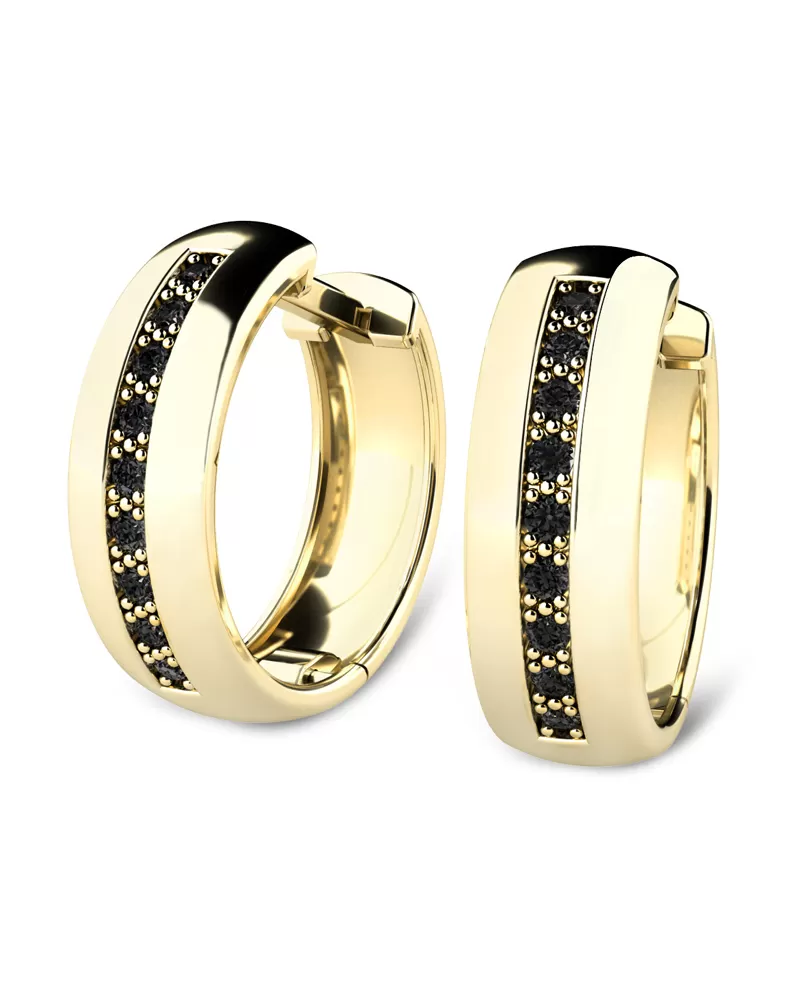 Náušnice kruhy patří mezi vůbec nejoblíbenější typ náušnic, náušnice jsou vhodné pro každodenní nošení i na společenské akce a sluší každé ženě! Jsou vyrobeny ze žlutého čtrnáctikarátového zlata - 585/1000 v lesklé povrchové úpravě. V každé náušnici je vsazeno "do zrnek" devět kulatých diamantů černé barvy. Vsazování diamantů provádějí naši nejzkušenější mistři zlatníci ručně pod mikroskopem s přesností na 0,01mm a proto nehrozí vypadnutí diamantů jako to bývá u strojně vyráběných šperků. Náušnice jsou středně velké, na uchu vypadají elegantně a přirozeně!
